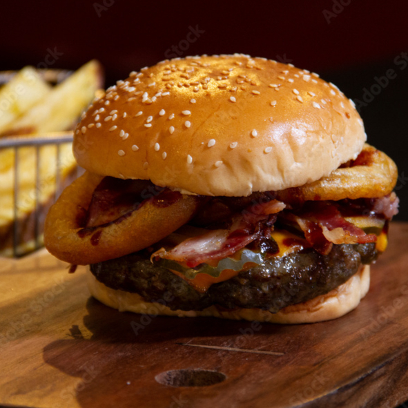 Hamburguesa de res con crujiente tocino y aros de cebolla dorados servida con queso fundido. Sabor potente, jugada ganadora.