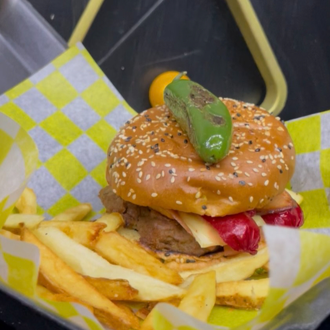 Hamburguesa de res con salchicha roja, cebolla caramelizada y queso americano fundido y chile serrano toreado. El sabor que define la partida.