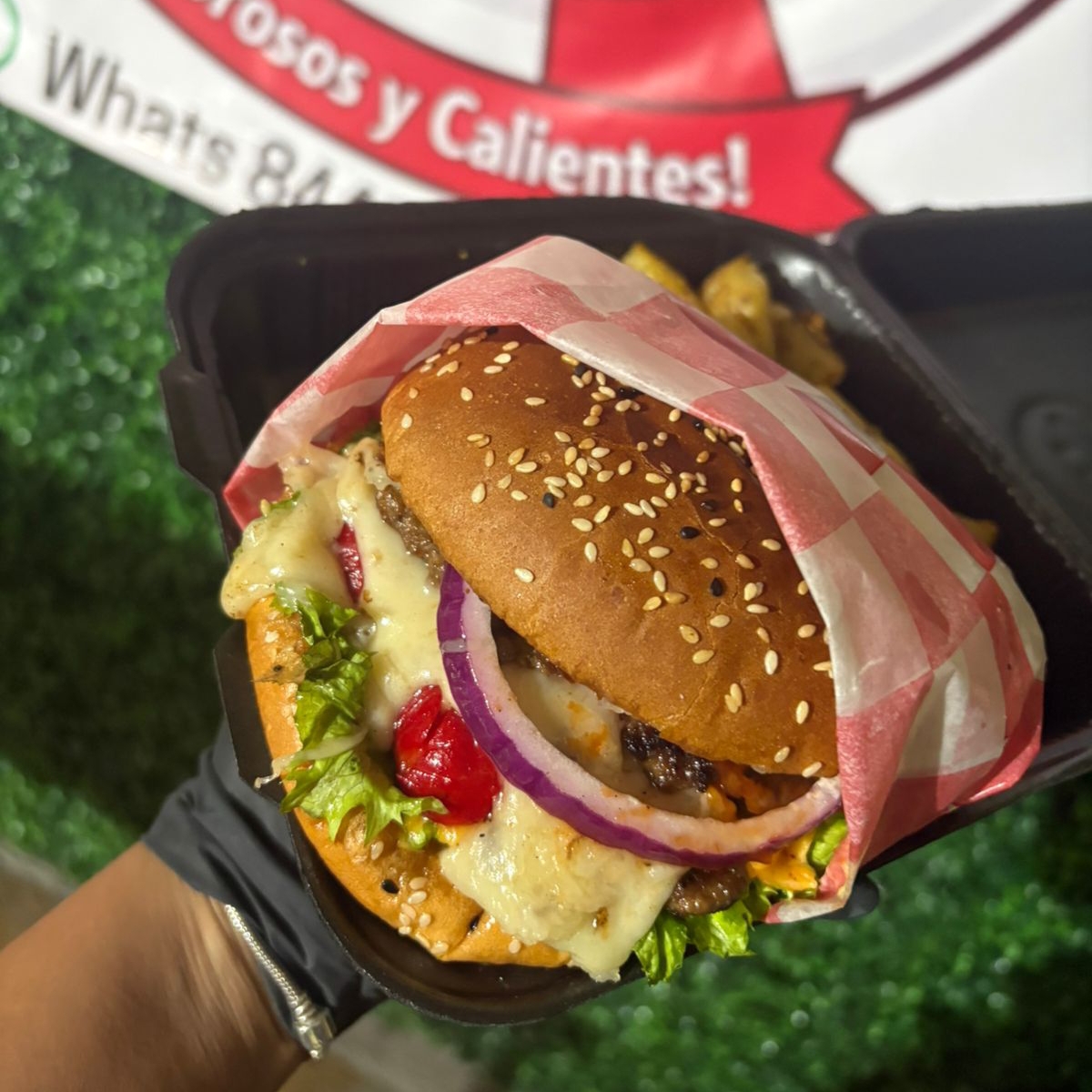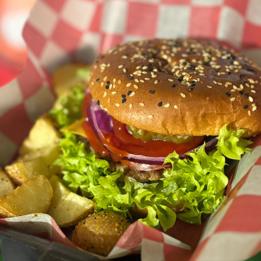 pan parrillero, carne de res, queso americano, mayonesa, lechuga, tomate, cebolla morada, pepinillos y catsup