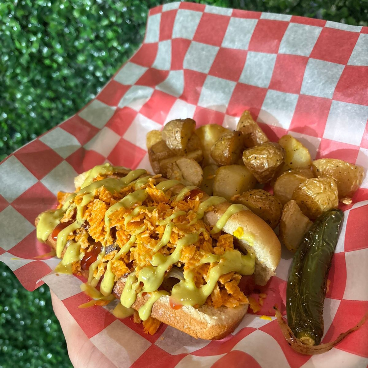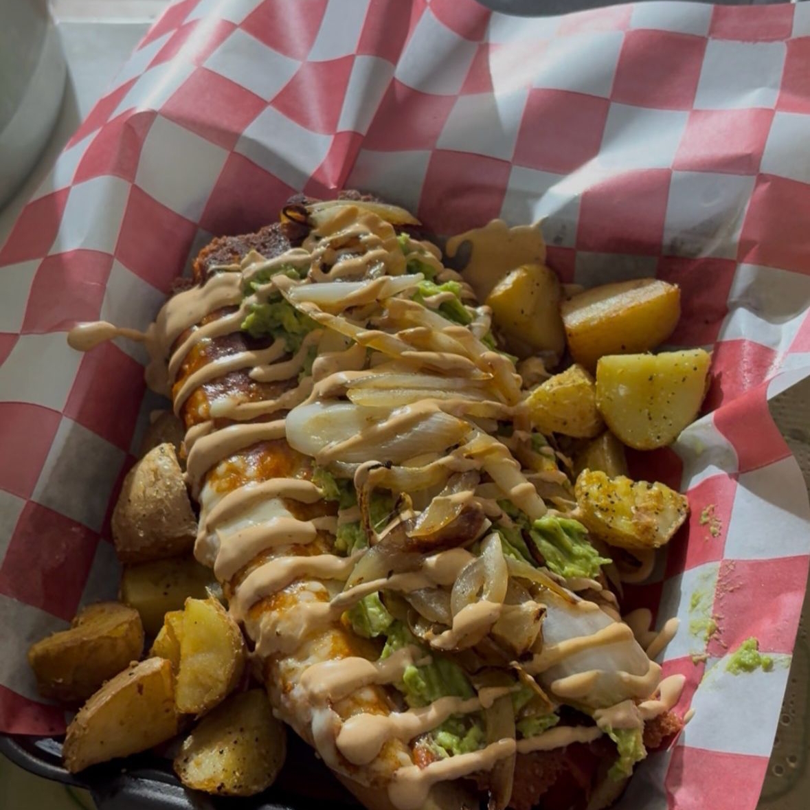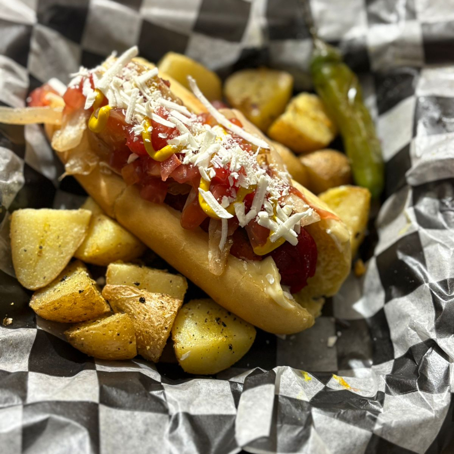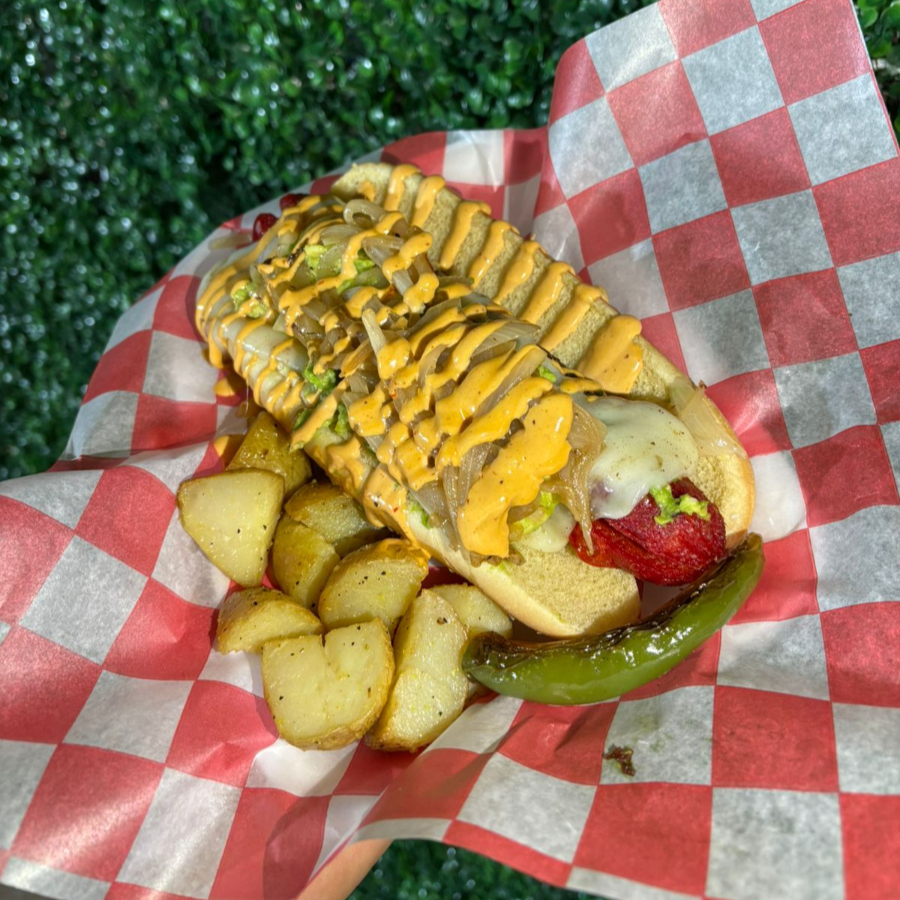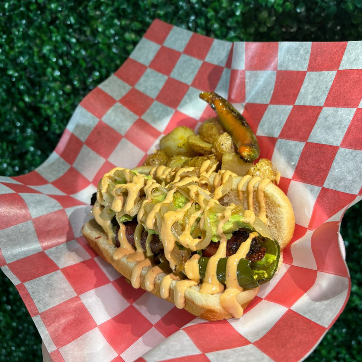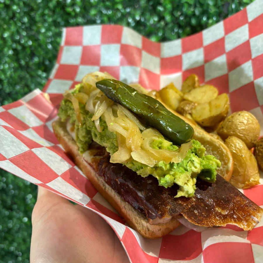 pan media noche, salchicha de pavo envuelta en tocino con queso philadelphia y chile jalapeño, aguacate, cebolla asada y aderezo chipotle