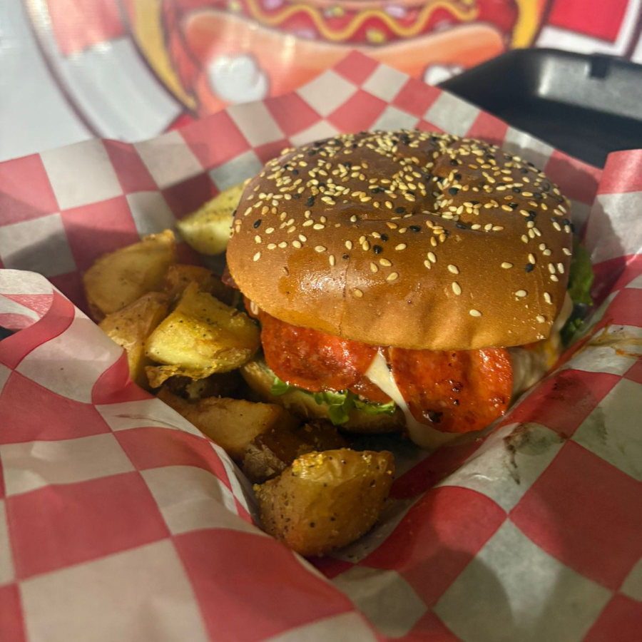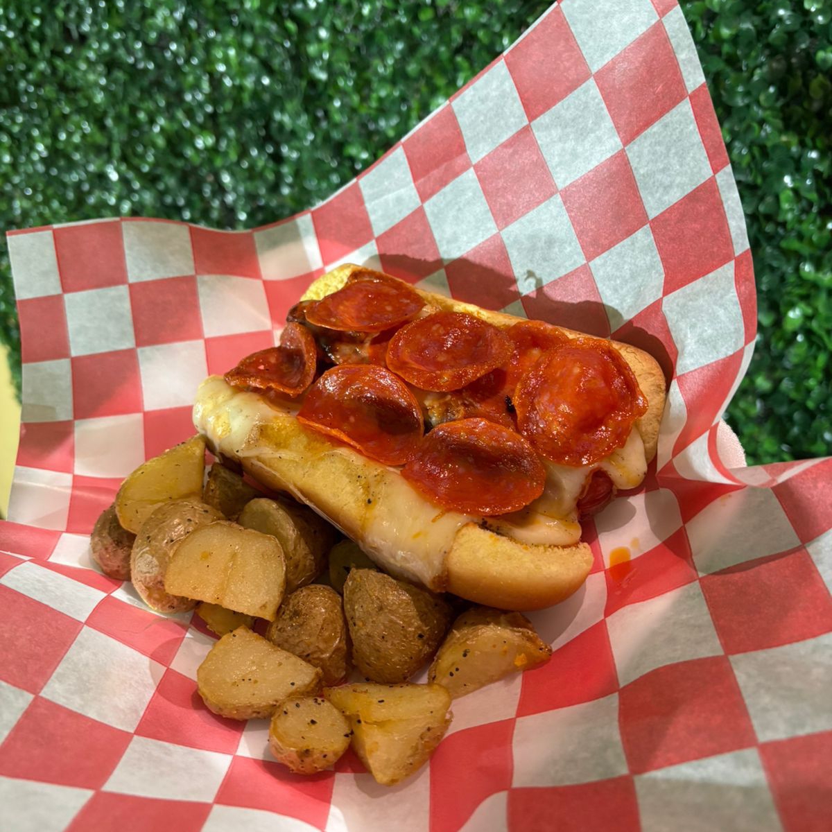 pan brioche, salchicha de pavo, salsa para pizza, queso mozzarella y pepperoni