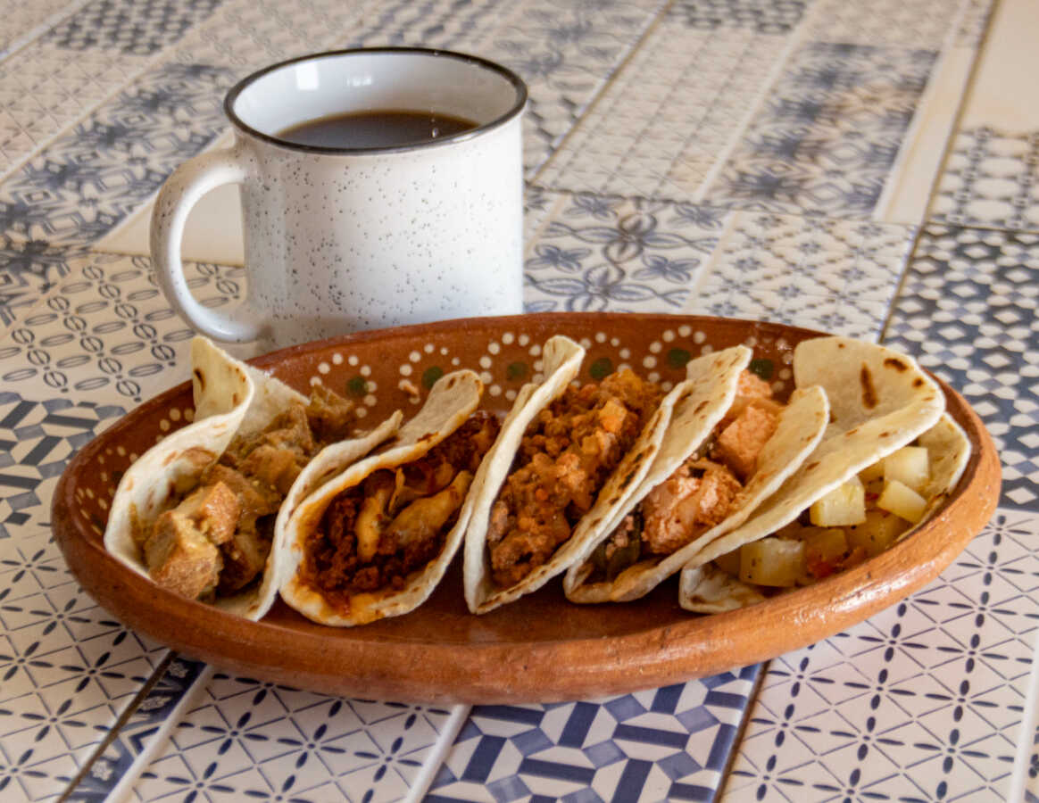 5 tacos variados en harina lista acompañados de un cafecito americano.