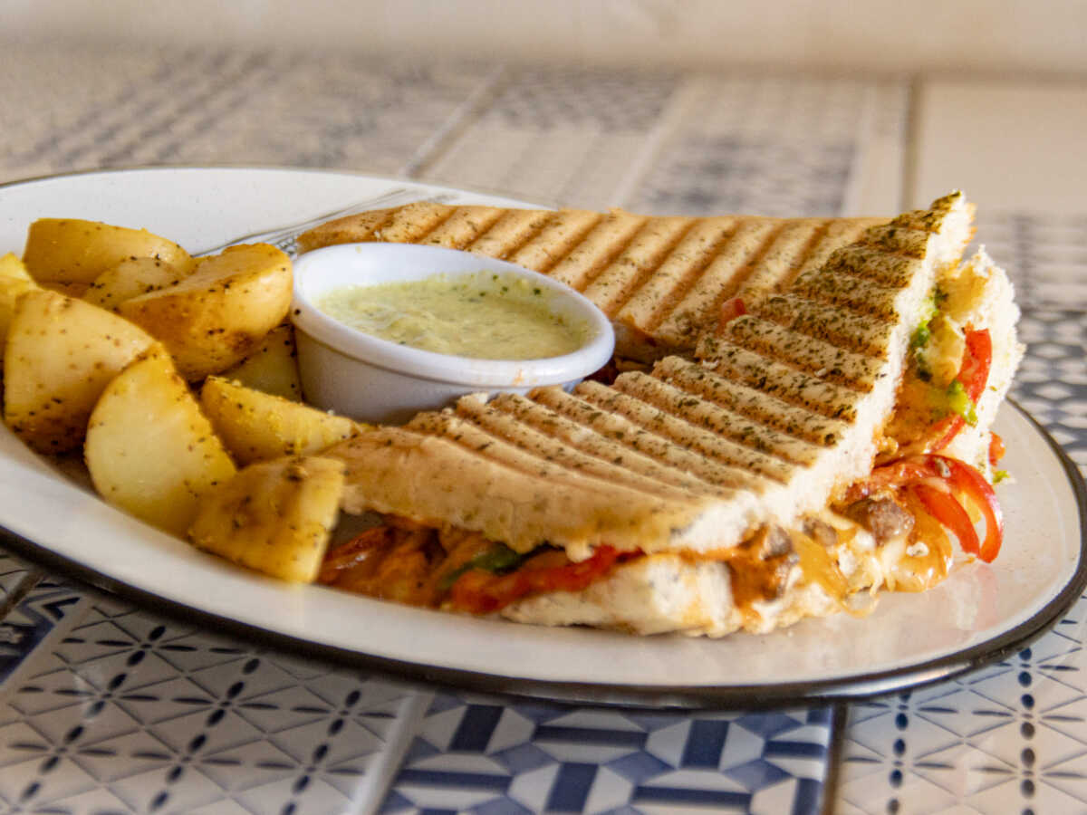 Delicioso sirlon, cebolla con pimientos caramelizados, una cama de aguacate aguacate y aderezo chipotle montado en un riquisimo panini finas hiervas, de topping nuestras deliciosas papitas sazonadas con lemon pepper e incluye tambien un aderezo cremoso para dieppearlas.