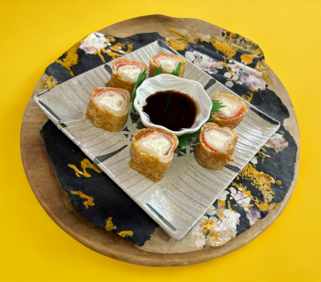 Surimi relleno de queso crema, capeado y bañado en salsa de anguila.
