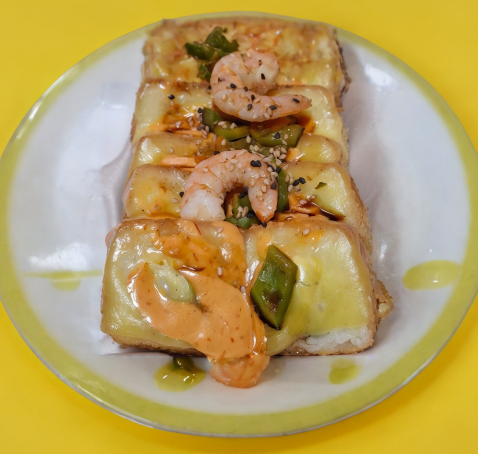 Bola de arroz rellena de cielo, mar y tierra, tampico, aguacate, queso crema,. Empanizada cubierta con queso manchego y tocino frito bañada en salsa de anguila y spicy.