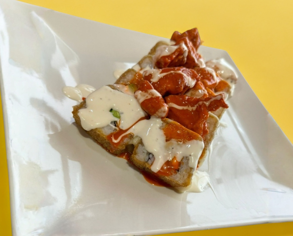 Camaron, aguacate y queso crema por dentro. Capeado con un toping de Crunch con salsa spicy por encima.