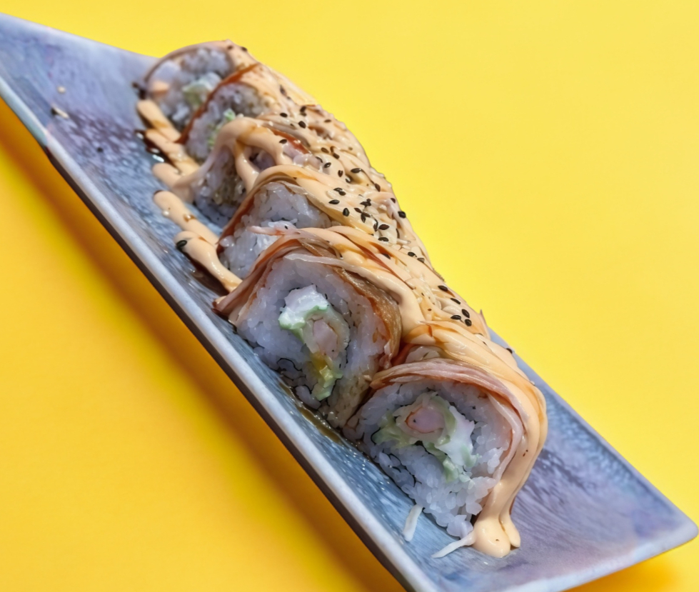 Camarón, aguacate y queso crema por dentro. Capeado con un toping de kanikama picante y bañado en salsa de anguila