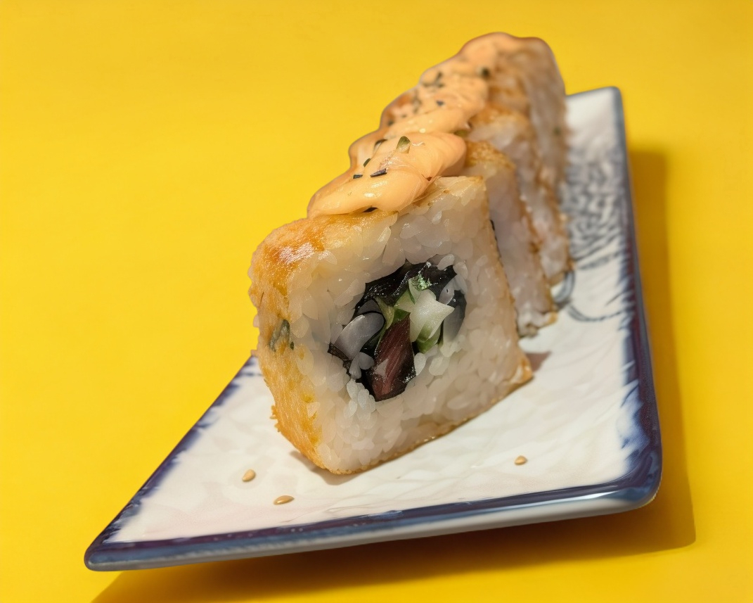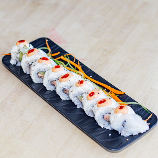 Camarón y queso crema por dentro. Cubierto de ajonjolí con un toping de crunch con salsa spicy y aguacate por encima.