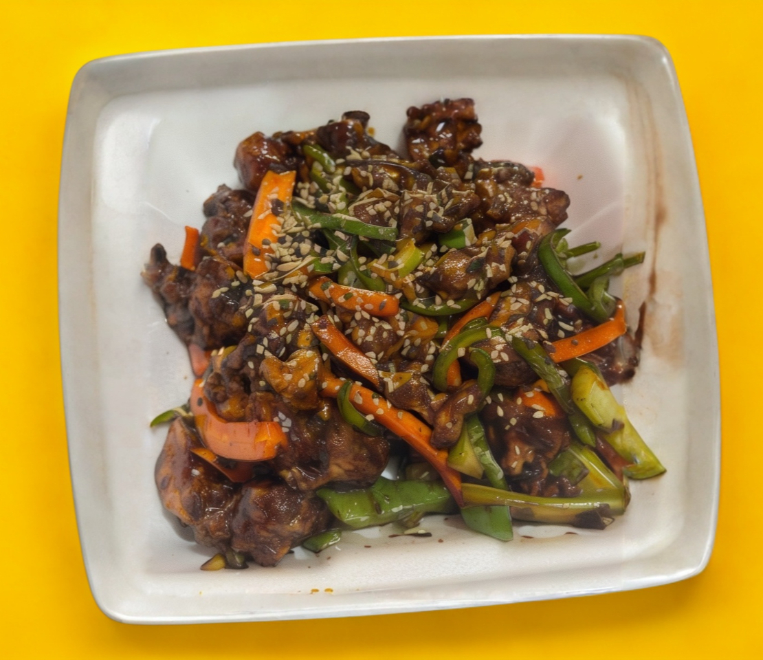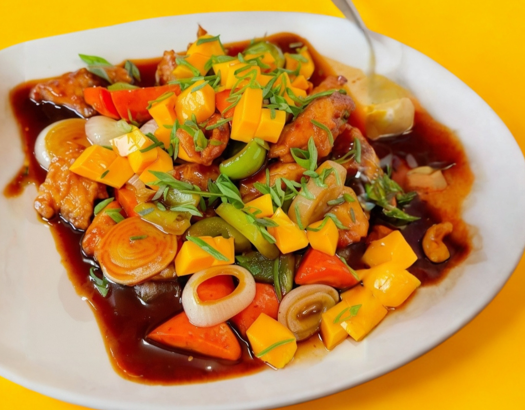 Pollo marinado con pimiento, cebolla y zanahoria en salsa agridulce.