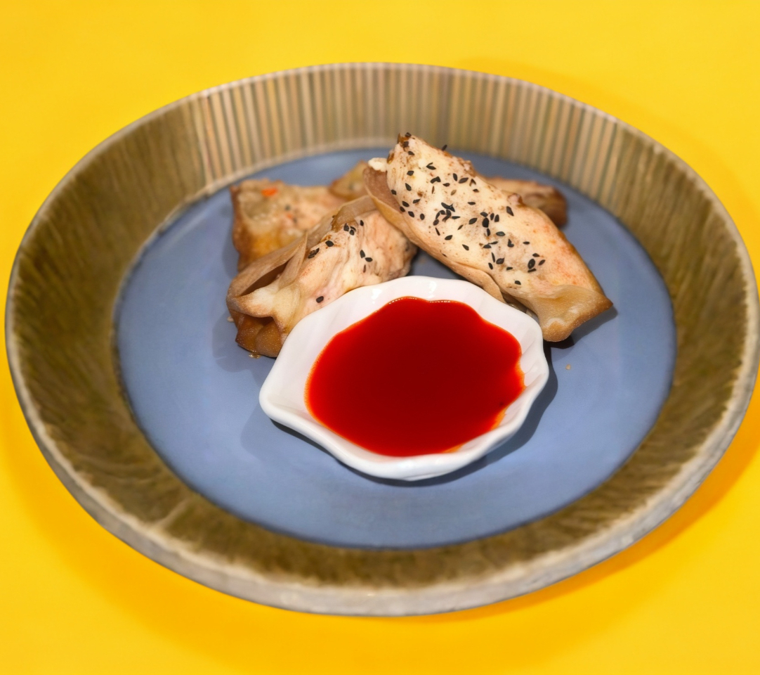 Tortilla a base de huevo, Rellena de Langosta, pasta de la casa. Acompañado de salsa agridulce.