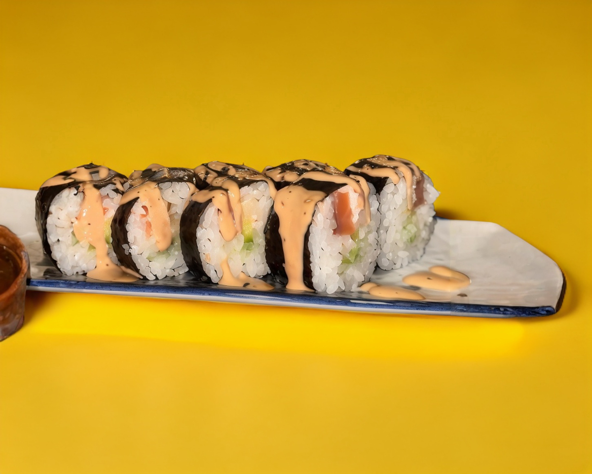 Salmon, aguacate y tampico por dentro. Cubierto de alga nori bañado con salda spicy