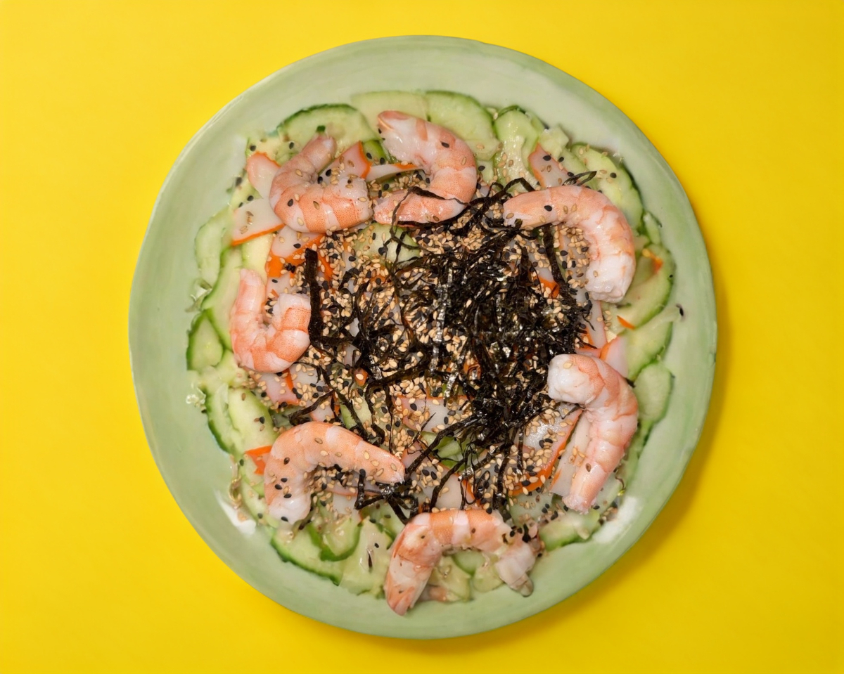 Pepino curtido con vinagre dulce, surimi troceado y camarón por encima, balado con ajonjolí tostado y trocitos de alga nori tostada.