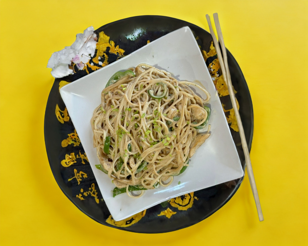 Deliciosa pasta cremosa acompañada de arrachera salteada con pimiento, cebolla y champiñón con un toque de soya