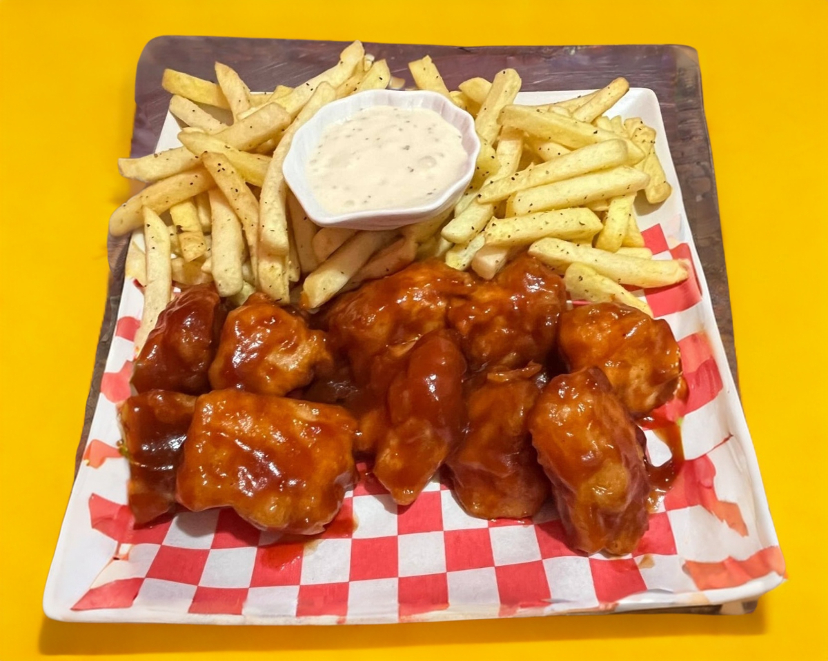 Trocitos de pechuga pollo, empanizados con la receta de casa, en salsa bbq, acompañado de papas fritas.