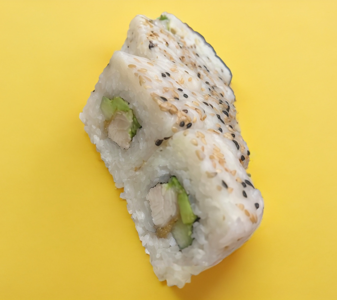 Pollo a la plancha, aguacate y pepino por dentro. Cubierto de ajonjolí tostado