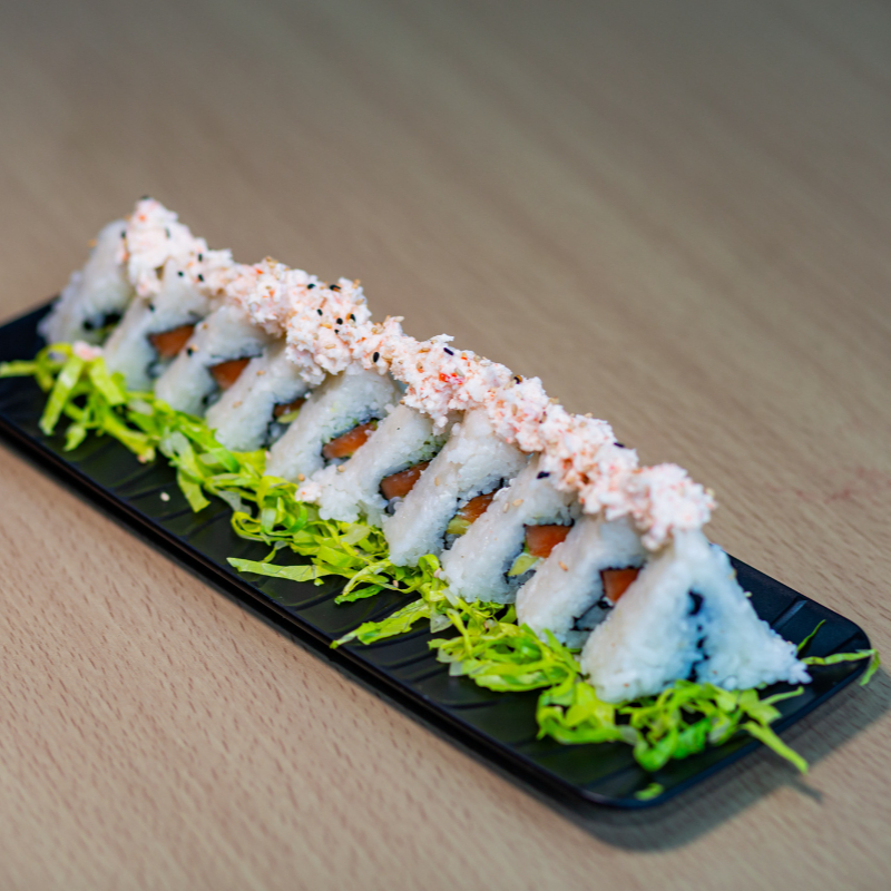 Salmon, aguacate y queso crema por dentro. Cubierto con ajonjoli tostado con toping de pasta tampico por enciama.