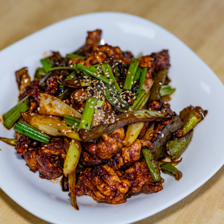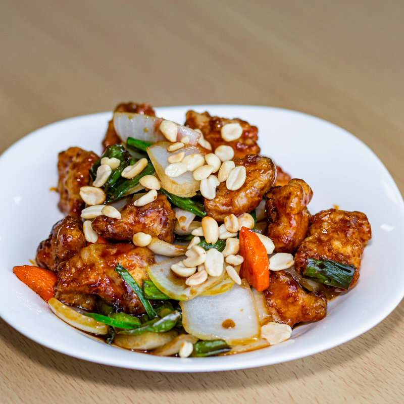Pollo marinado con pimiento, cebolla y zanahoria en salsa Kung pao.