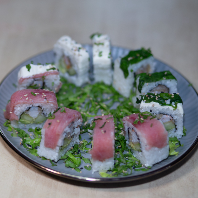 Camarón, aguacate y pepino por dentro. Cubierto con atún, queso crema y espinaca.