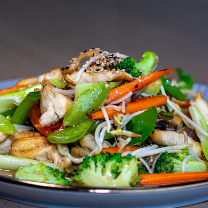 Mix de vegetales, Tallarín salteados en una rica salsa de ostión, con Pollo.