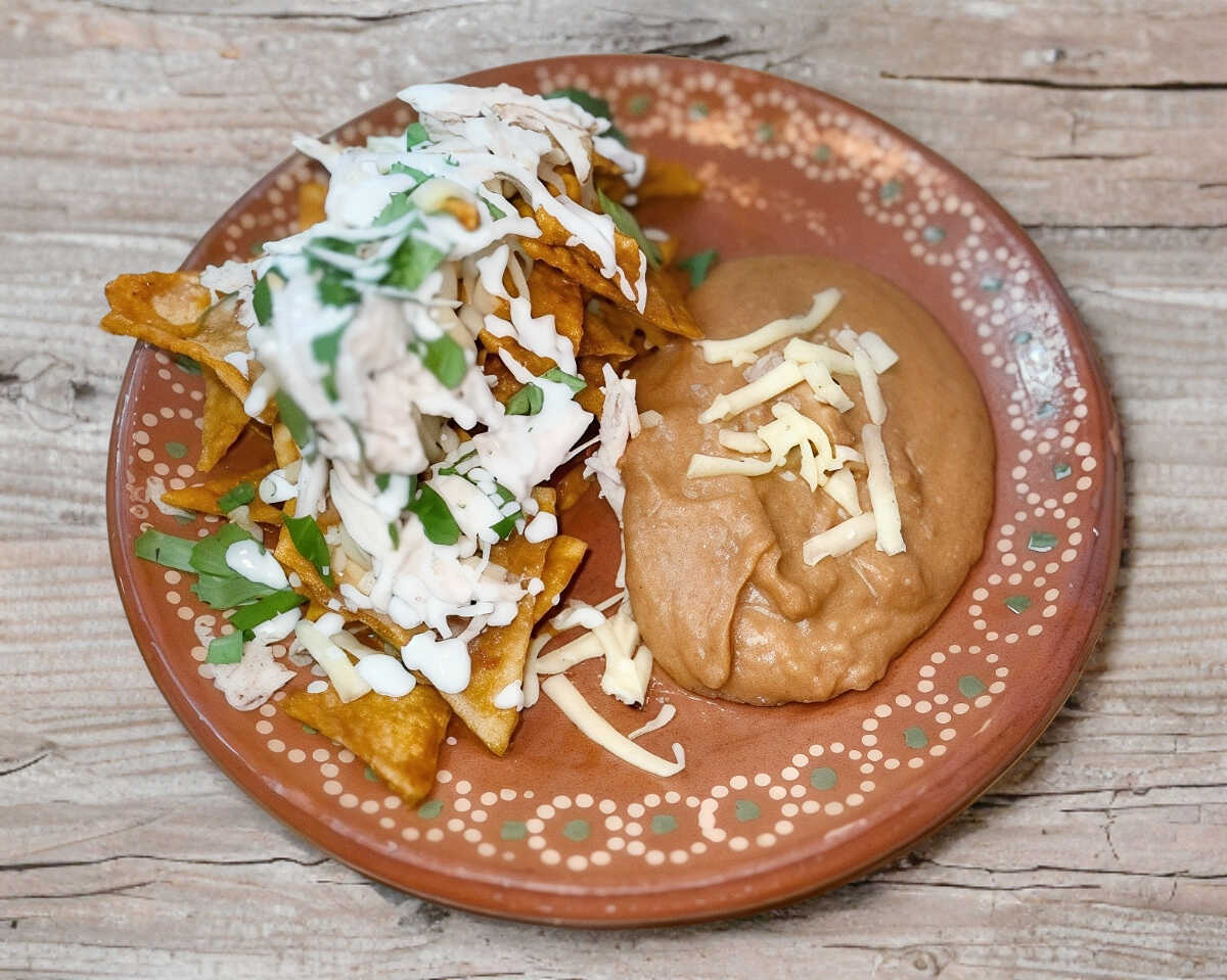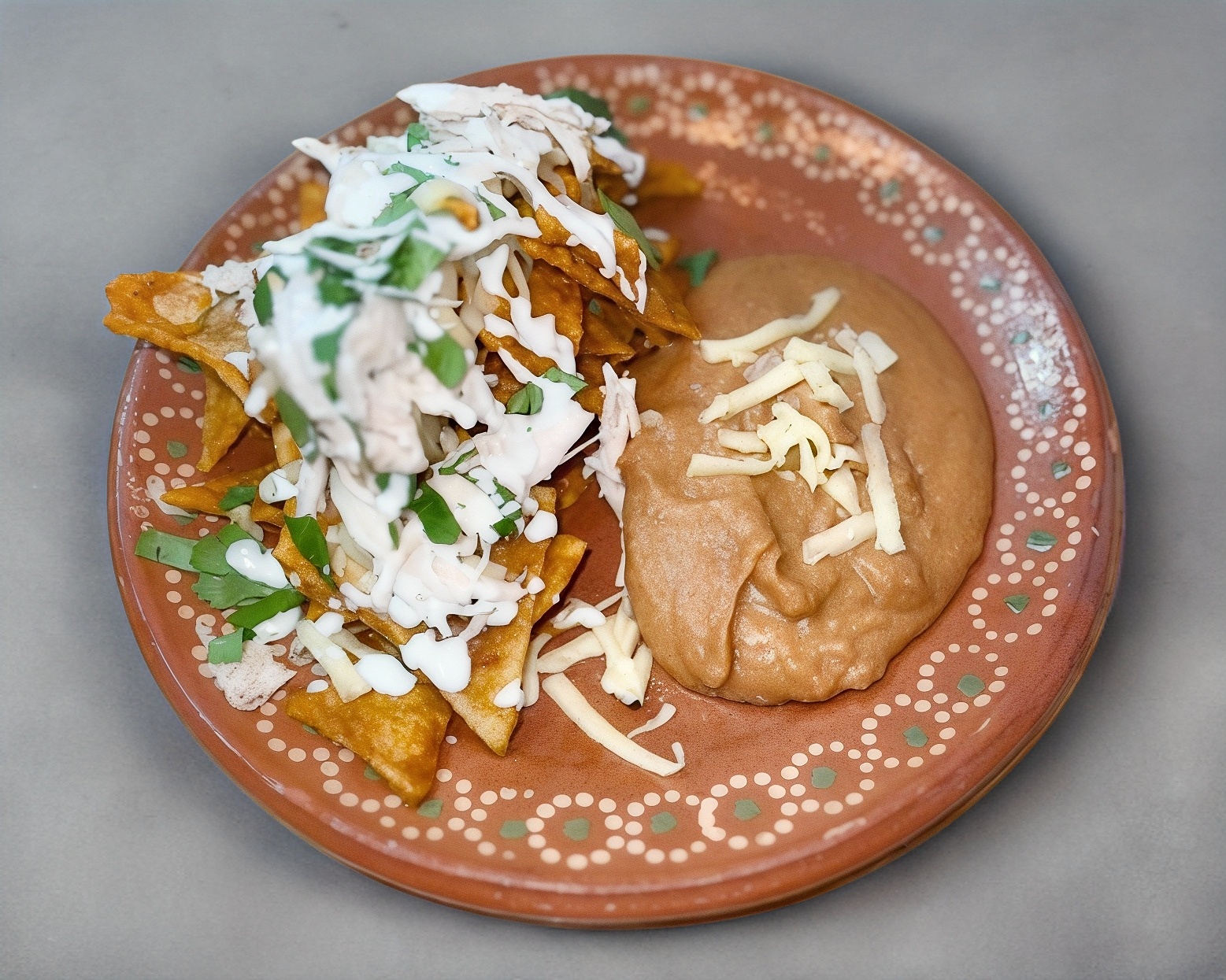 Chilaquiles en salsa morita con pollo , crema, queso, cebolla, cilantro , acompañado de frijoles refritos