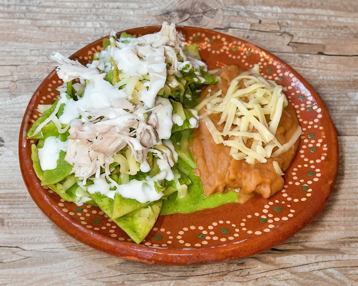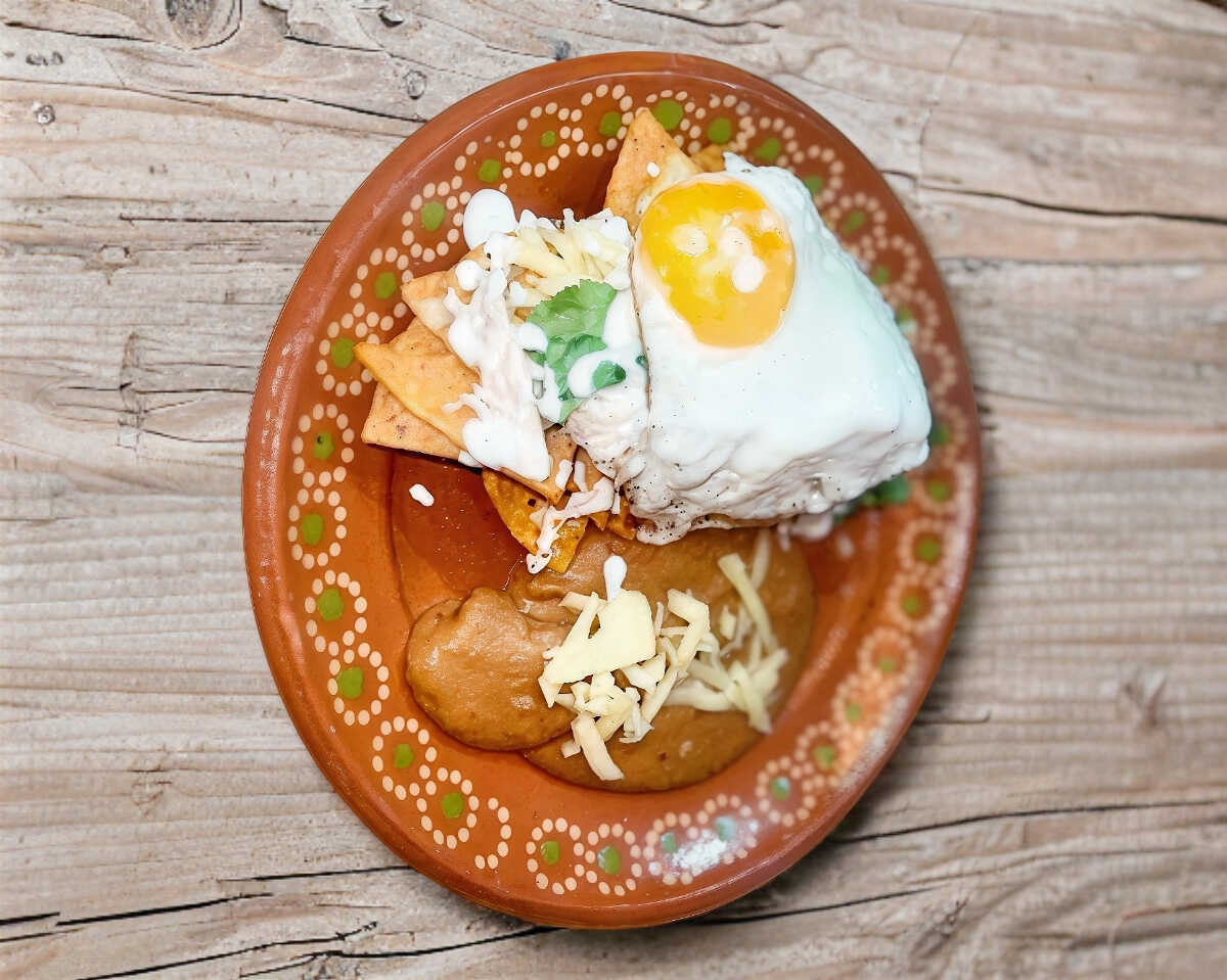 2 HUEVOS ESTRELLADOS MONTADOS SOBRE TORTILLA DORADA, BAÑADOS EN SALSA VERDE Y ROJA, ACOMPAÑADOS DE FRIJOLES REFRITOS