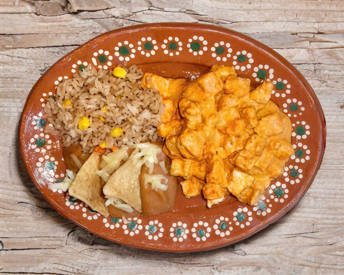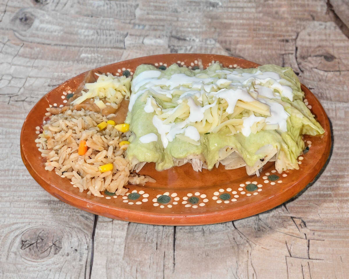 5 Tacos de pollo bañados en salsa verde cremosa , crema, queso gratinado, acompañado de arroz y frijoles
