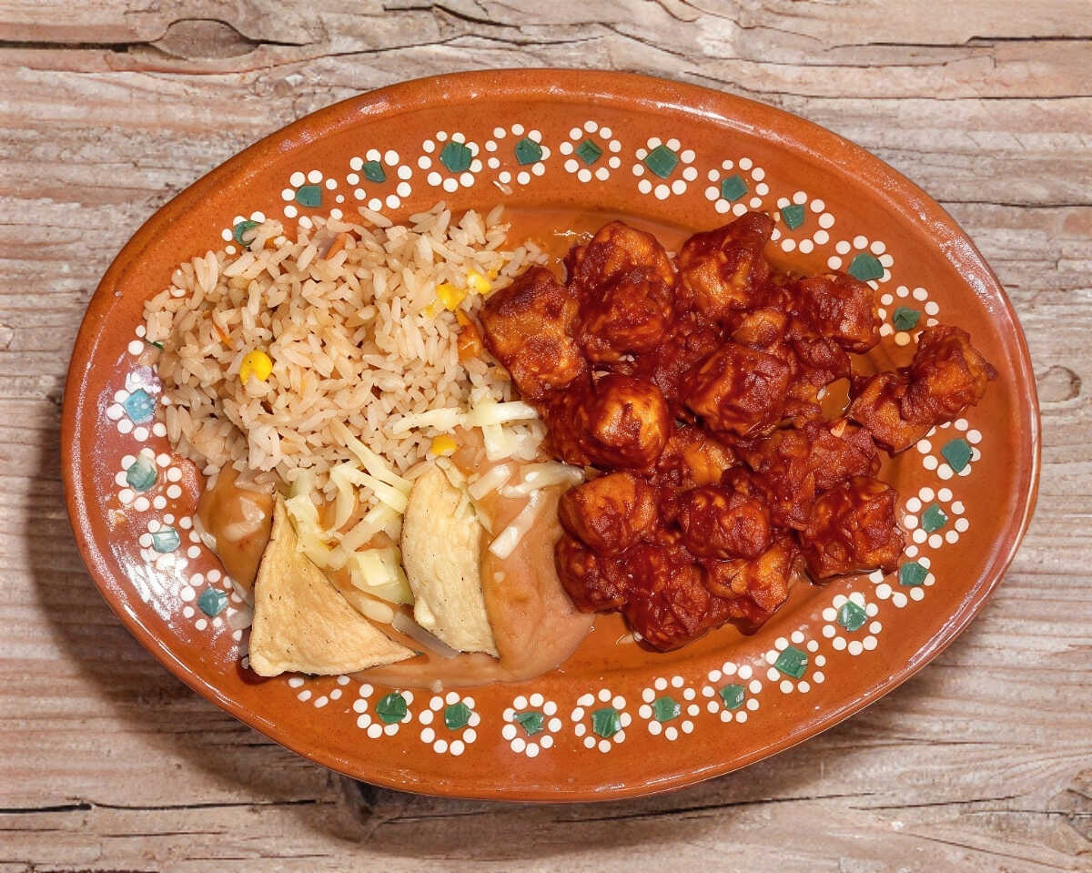 Pechuga de pollo en salsa chipotle cremosa, acompañado de arroz y frijoles.