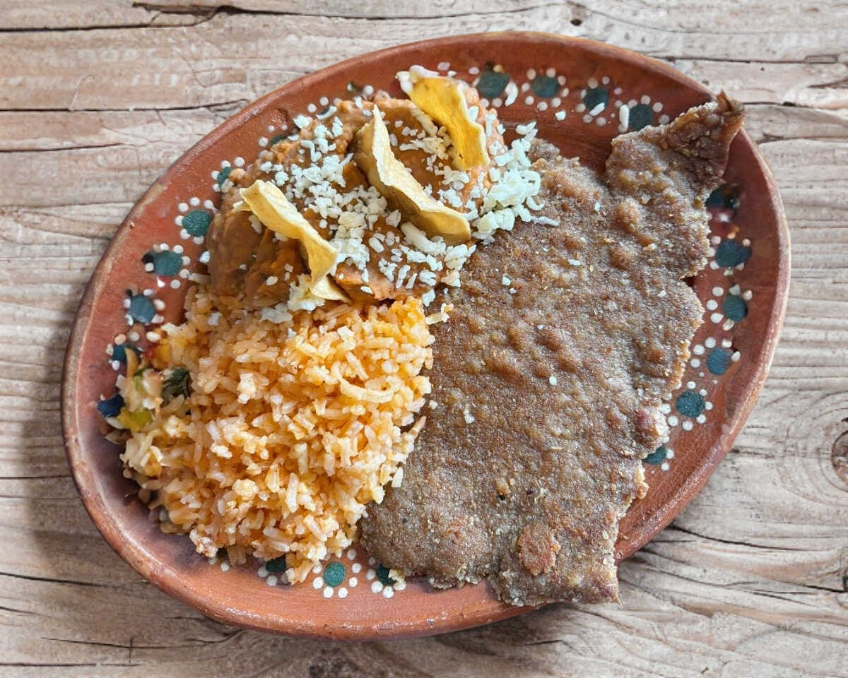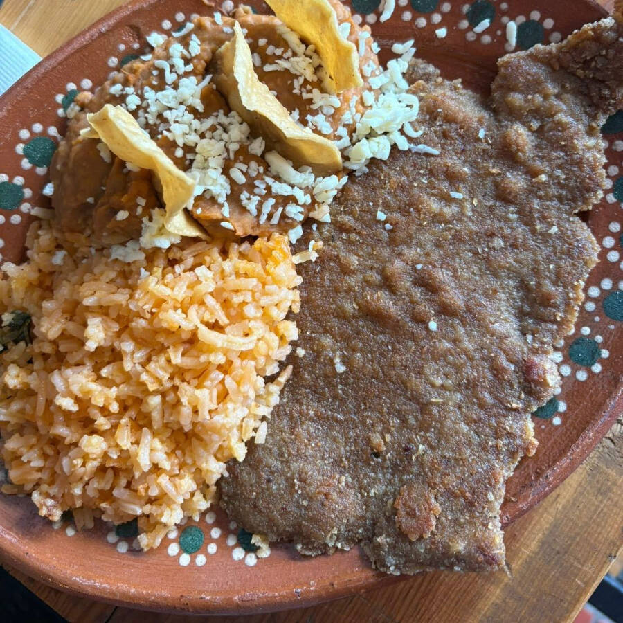 Milanesa de res empanizada, acompañada de arroz, frijoles y ensalada