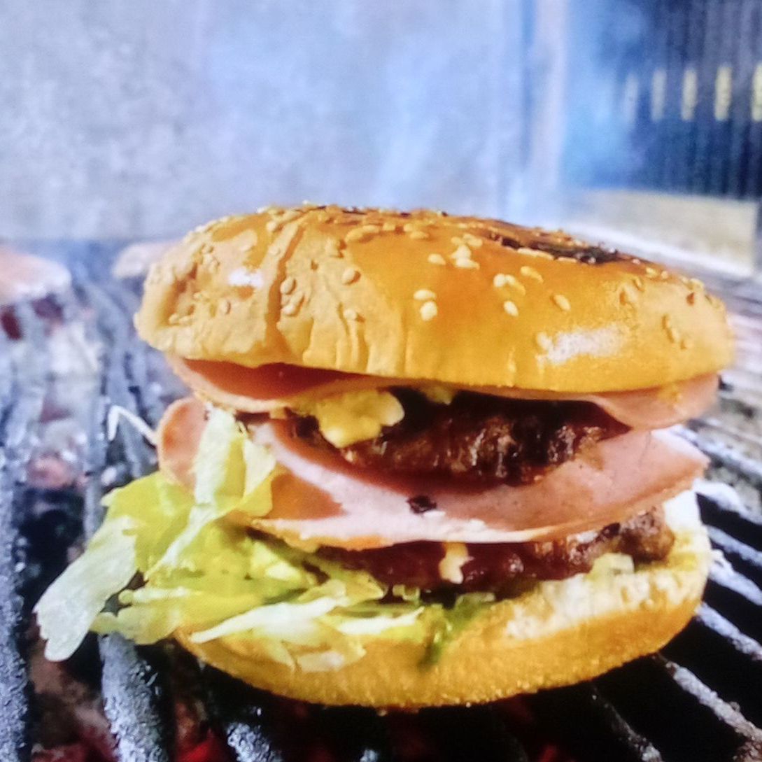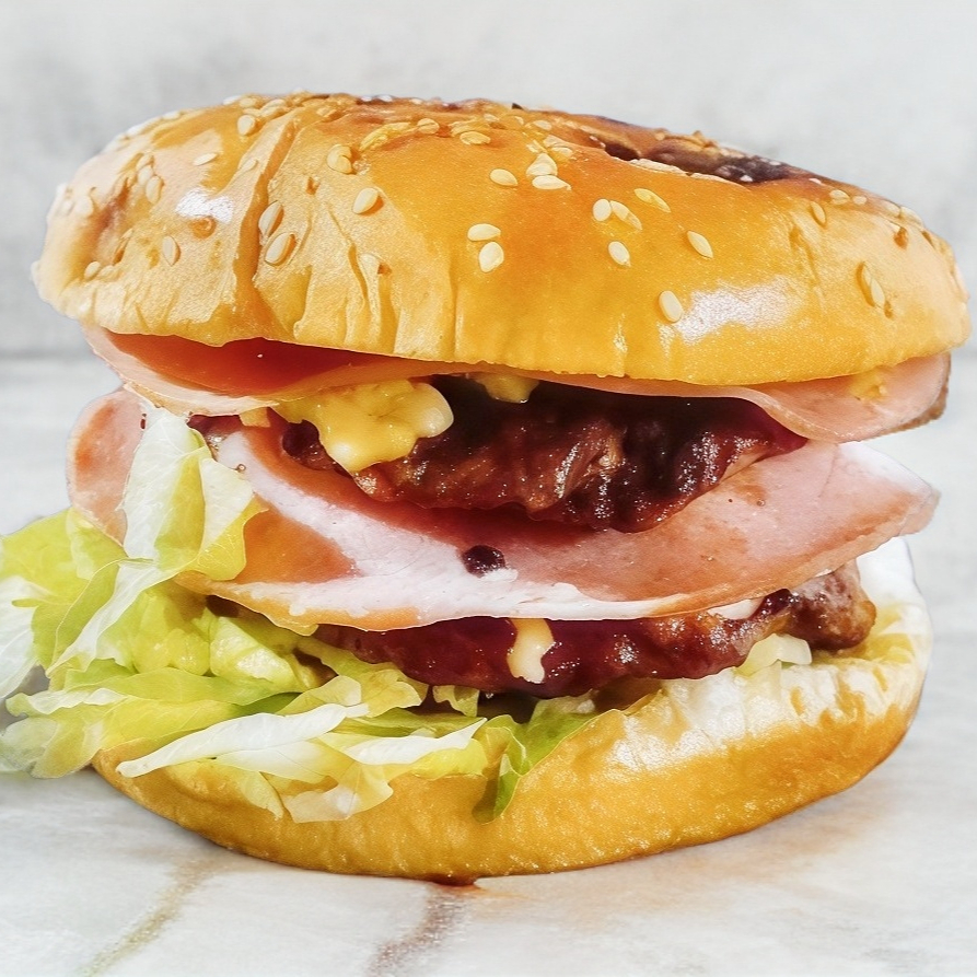Doble carne, doble queso, doble jamón, lechuga y aderezos
