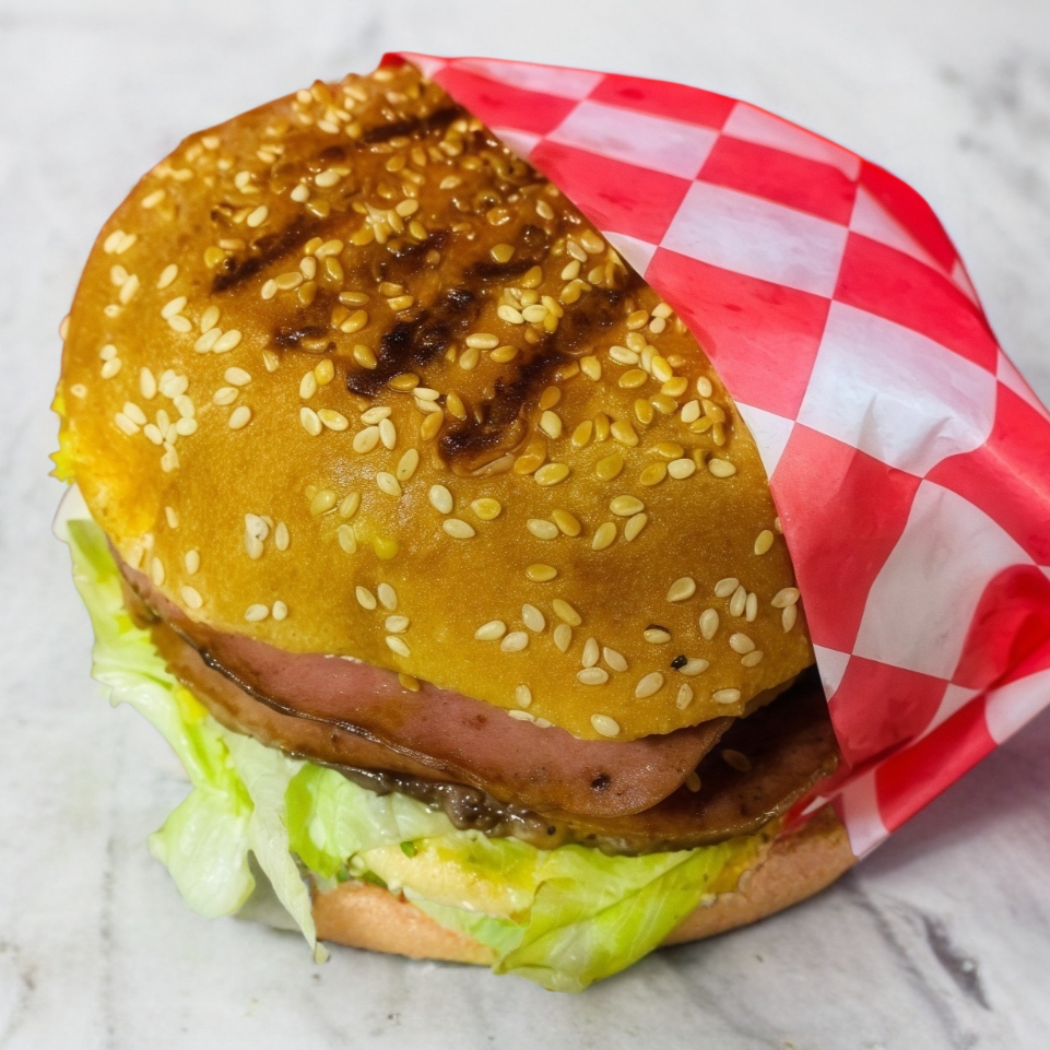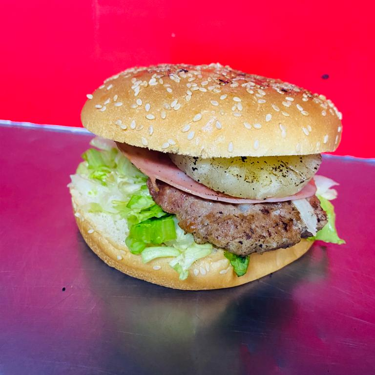 Doble carne, doble queso, doble jamón, lechuga, aderezos y rebanada de piña al carbon