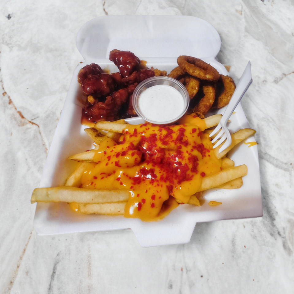 1/2 orden de boneless (en salsa Buffalo,bbq o mango habanero), 1/2 orden de papas naturales ó con queso y 1/2 orden de Nuggets ó aros de cebolla