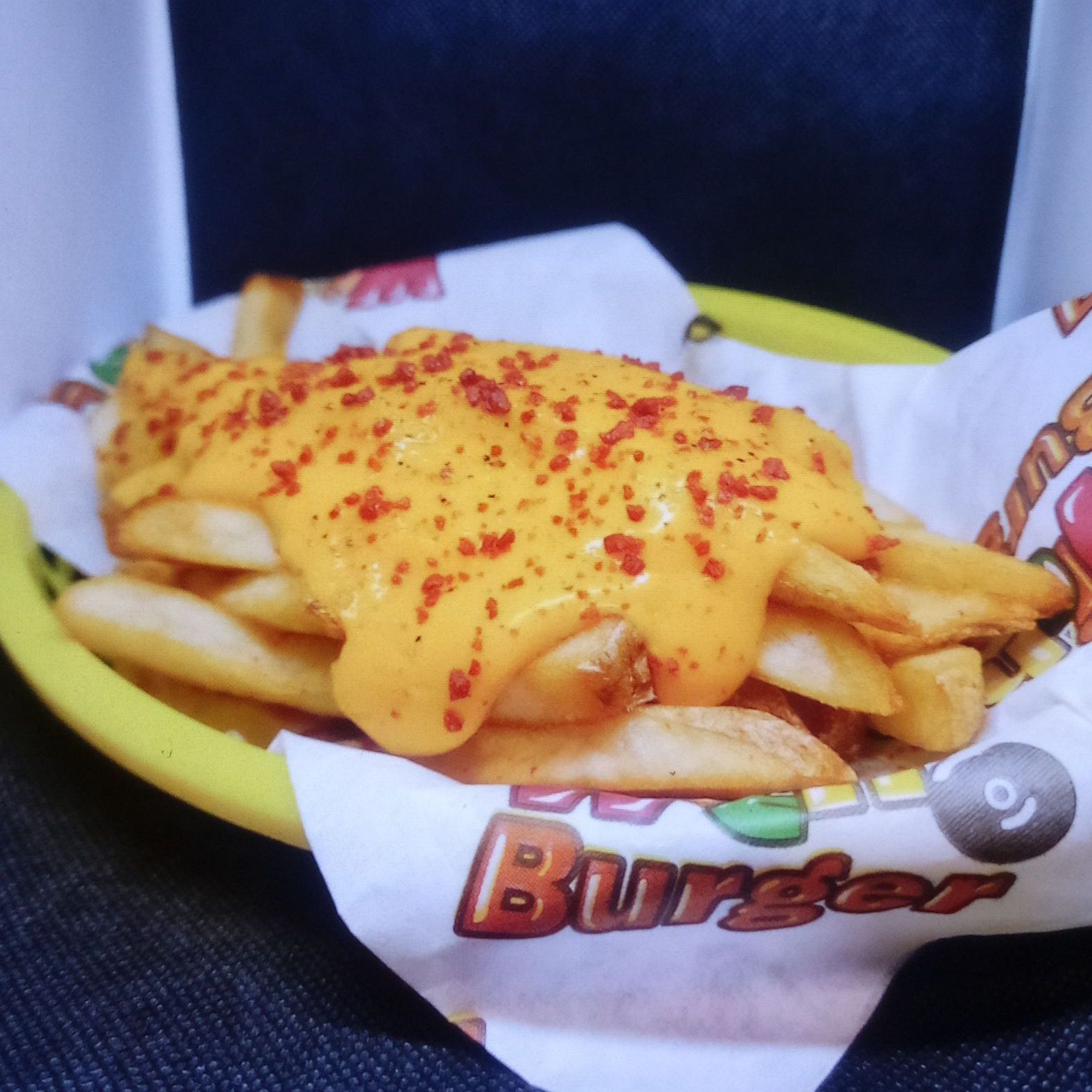 Papas a la francesa con pimienta limón, tocino y queso
