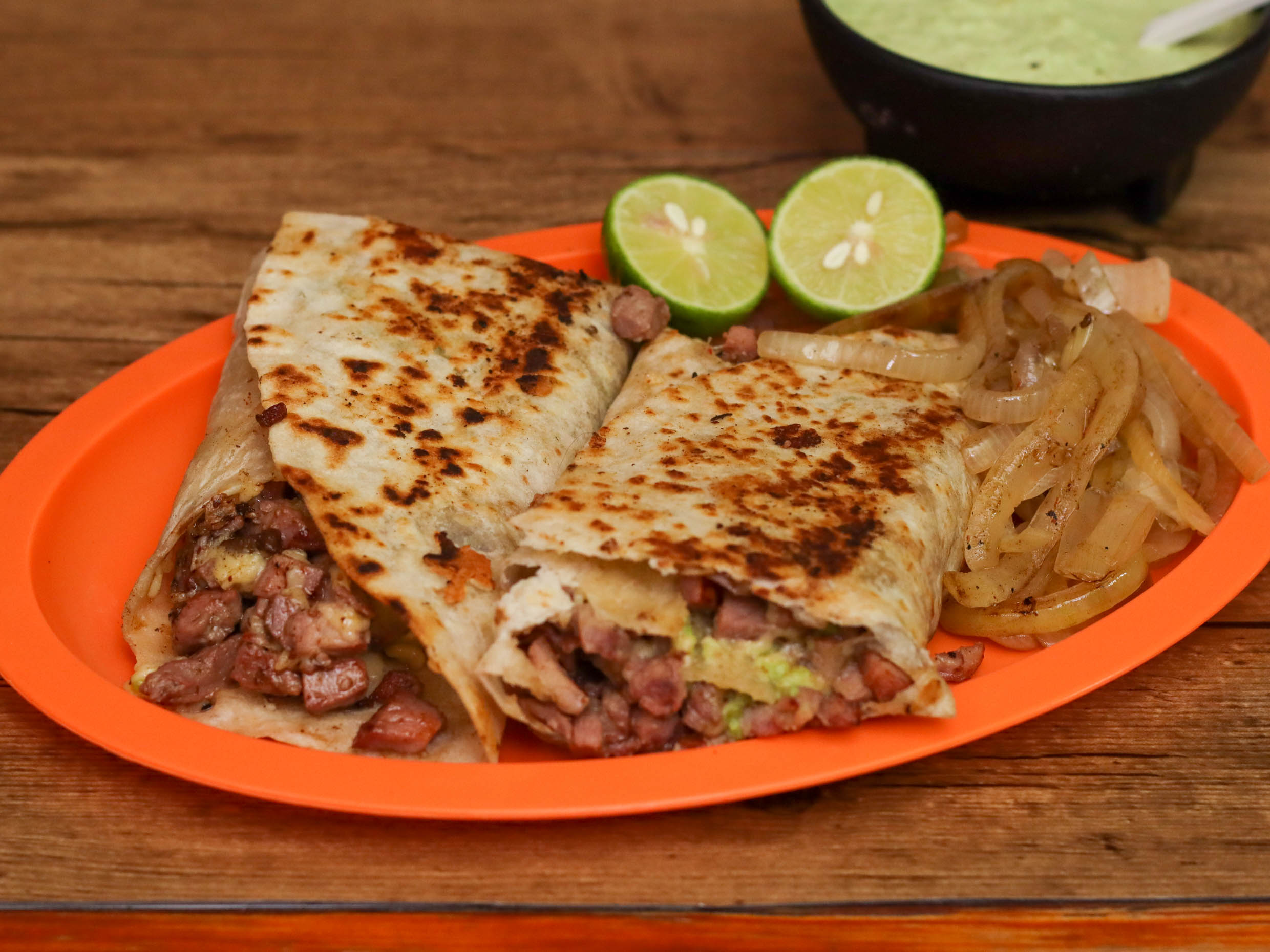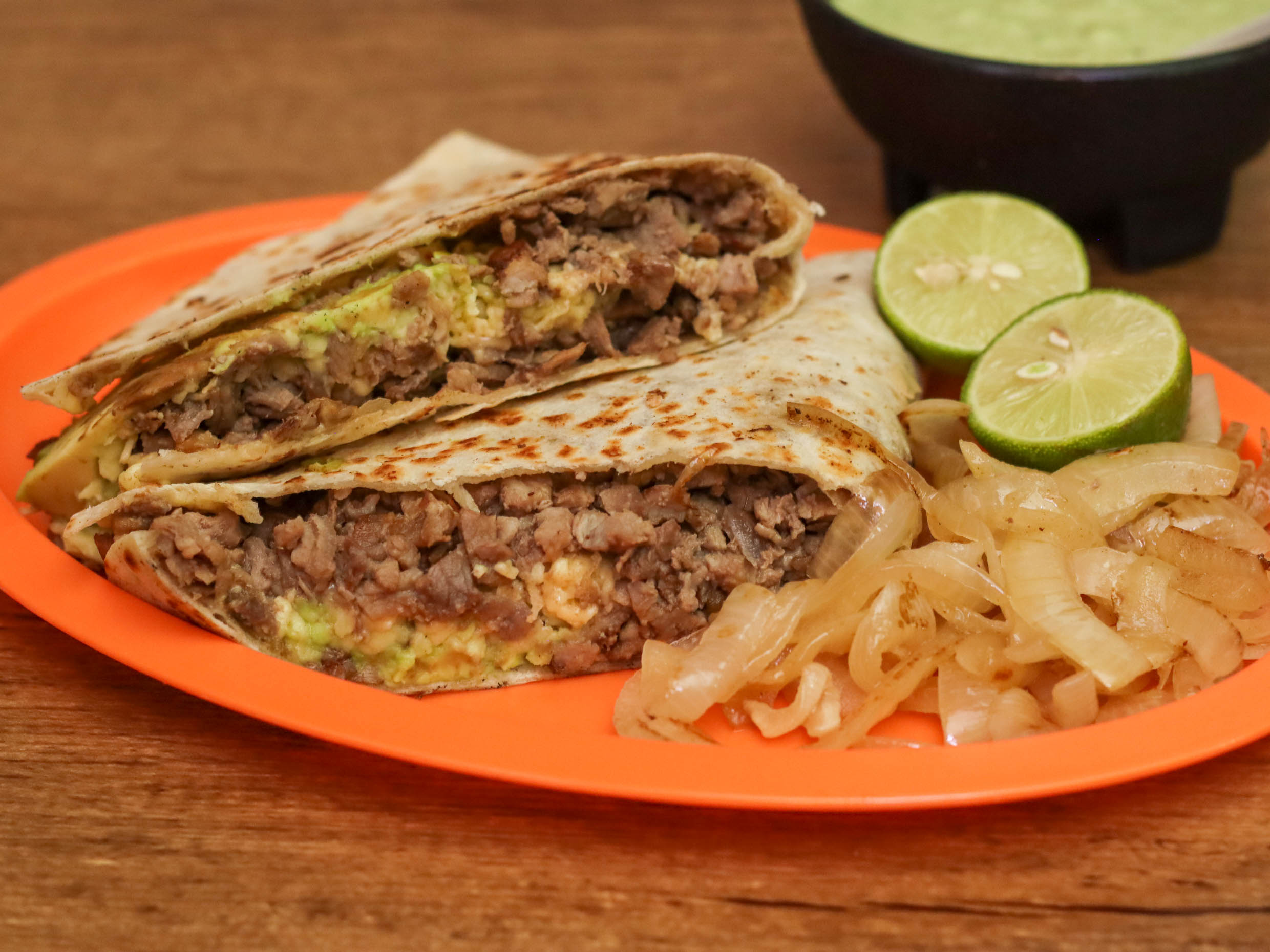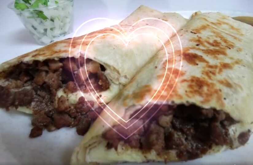 Taco grande de tortilla de harina con bistec aguacate y queso