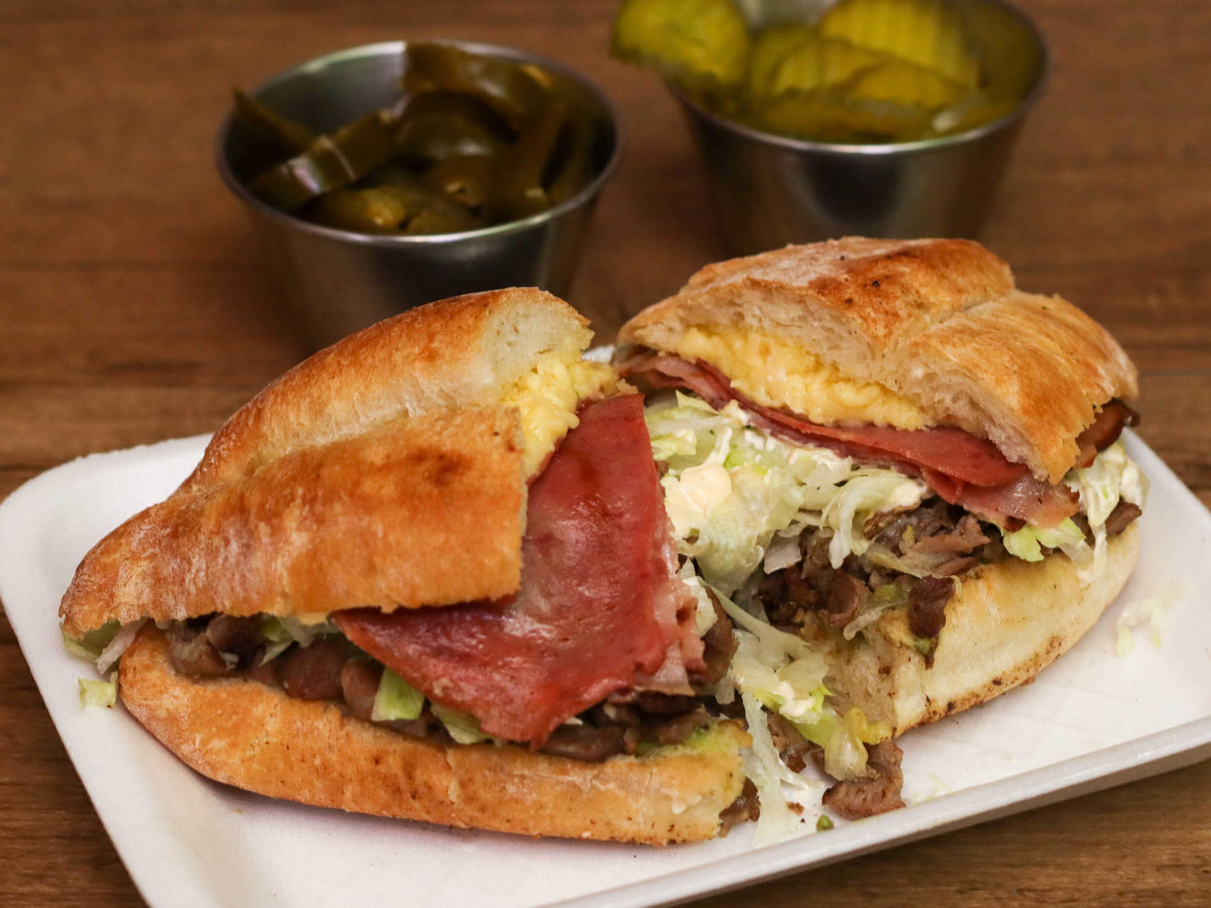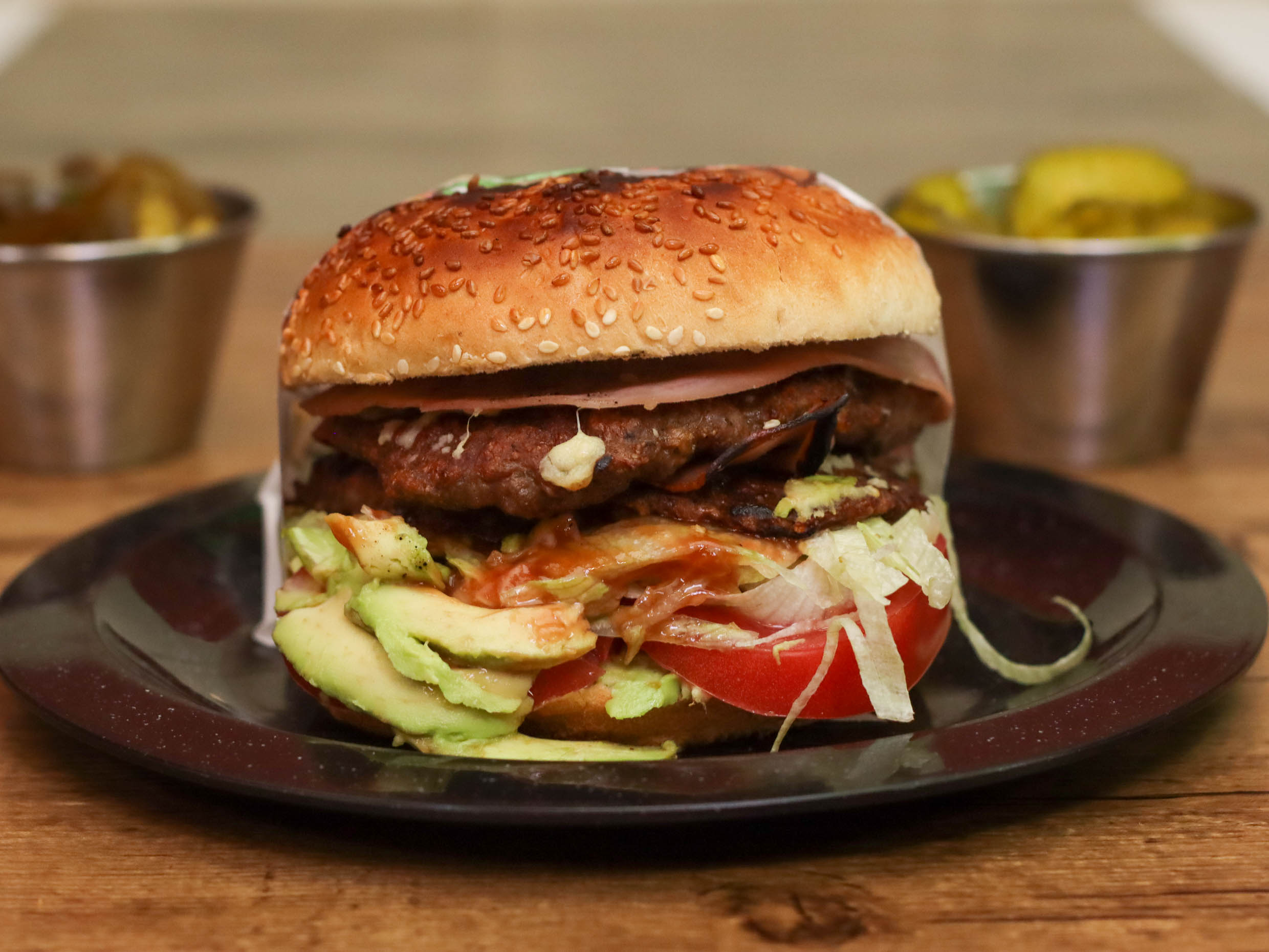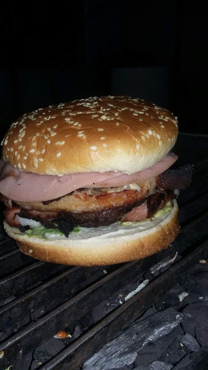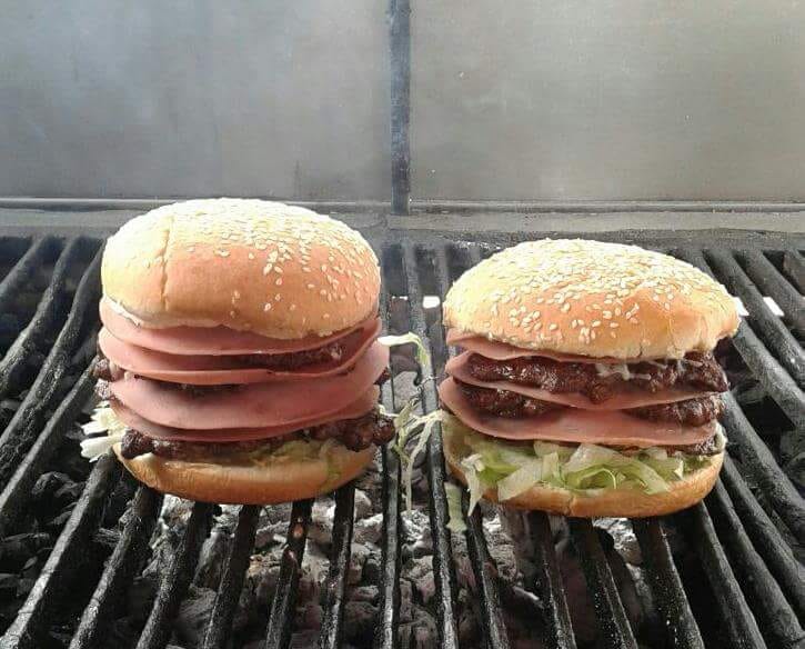 Hamburguesa con doble carne.jamon,queso blanco, aderezos, agucate, tomate y lechuga
