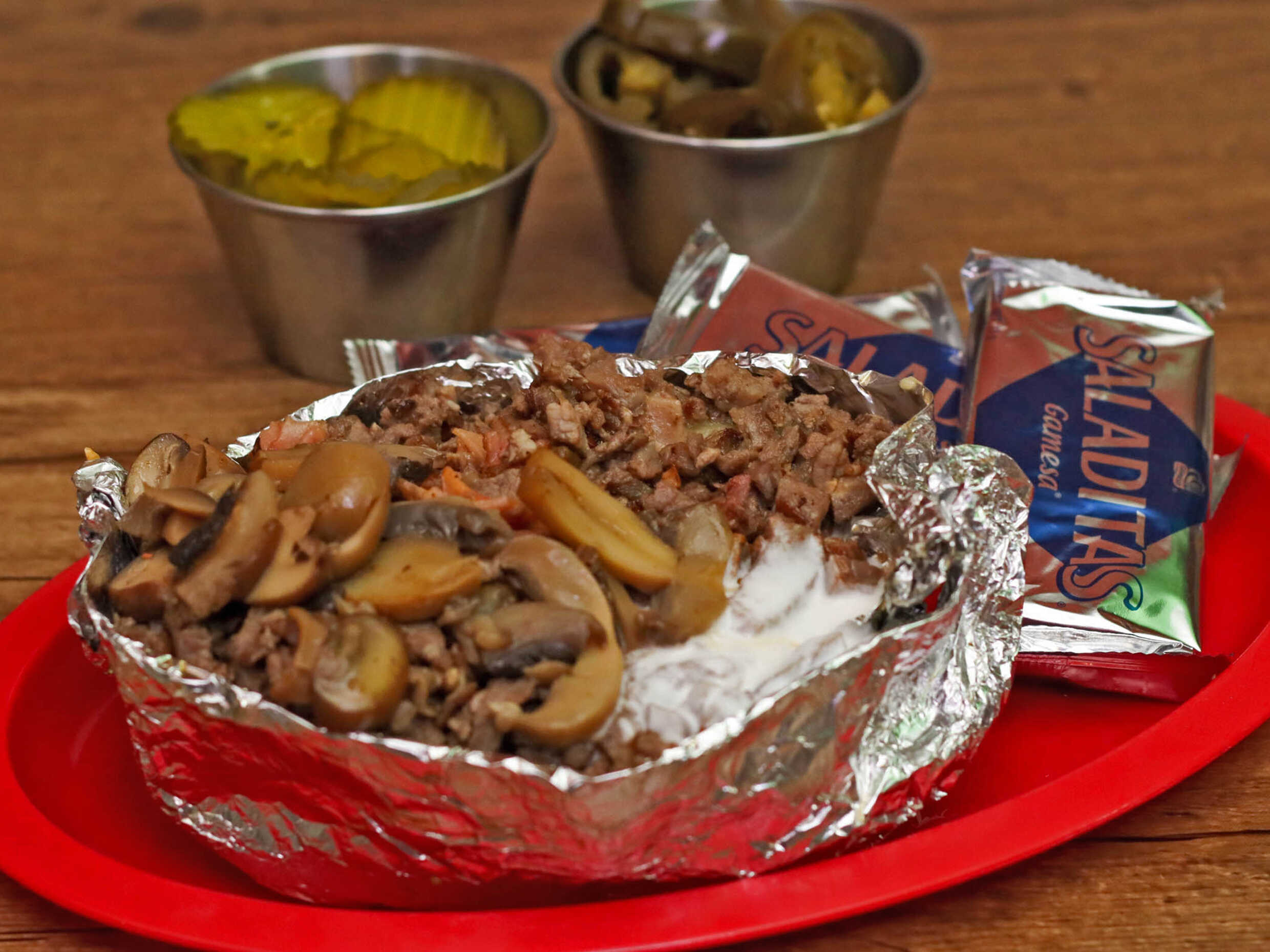 SALCHICHA DE ASAR RELLENA DE QUESO ENVUELTA CON TOCINO ,MAYONESA ,CATSUP,MOSTAZA, JALAPEÑO Y PEPINILLOS