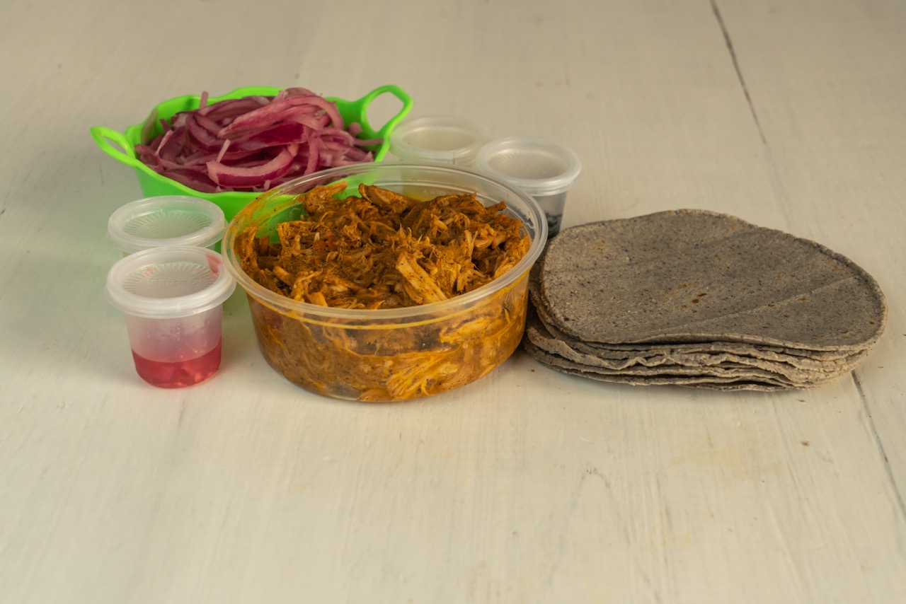 1 kg de cochinita pibil incluye tortillas cebolla curtida y salsas de habanero.