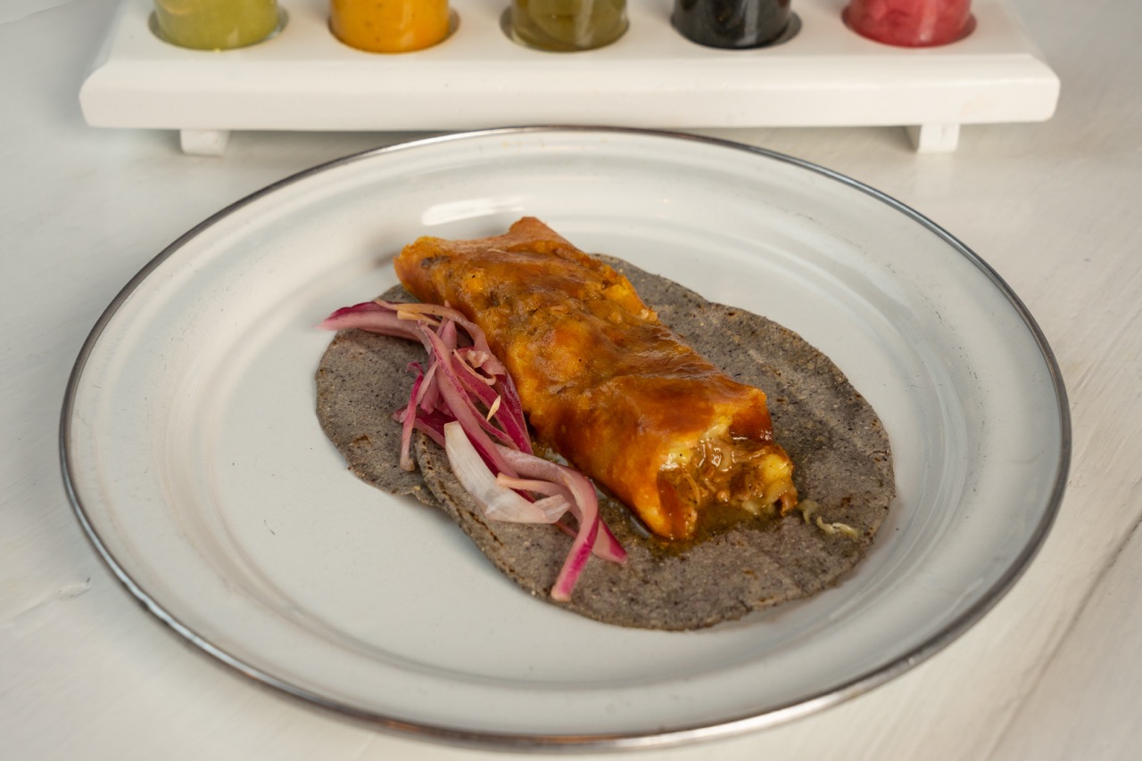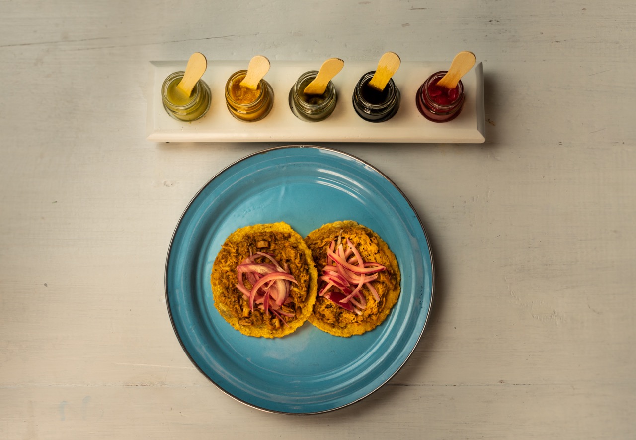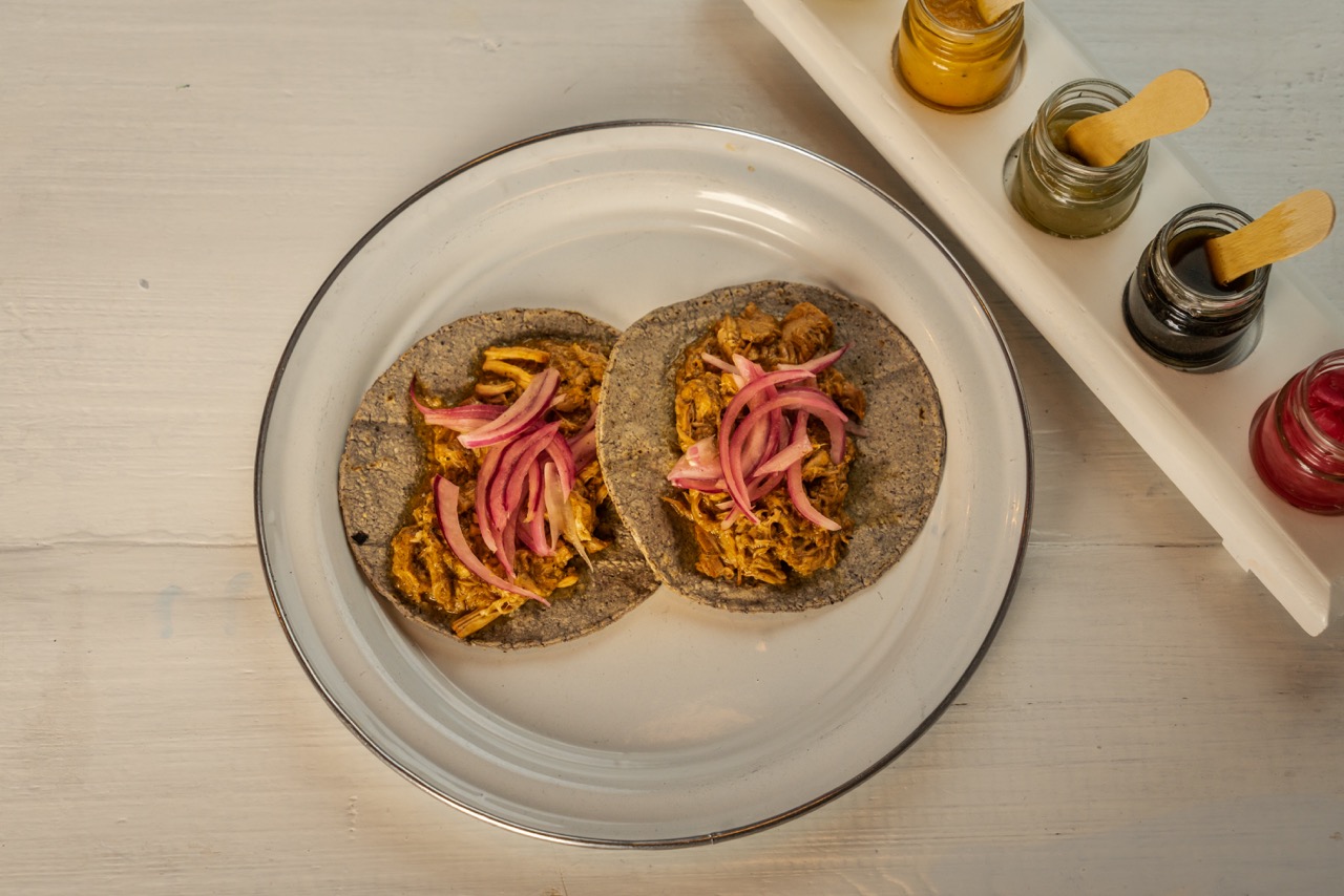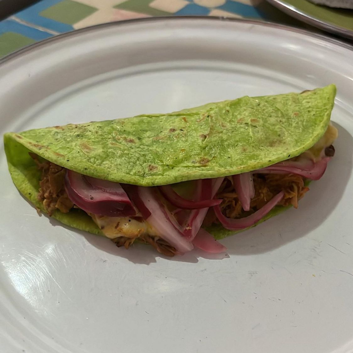 tortilla de harina sabor chipilin con deliciosa Cochinita pibil quesillo y cebolla morada
