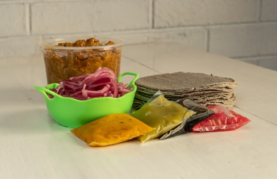 incluye salsas, cebolla morada y tortillas.