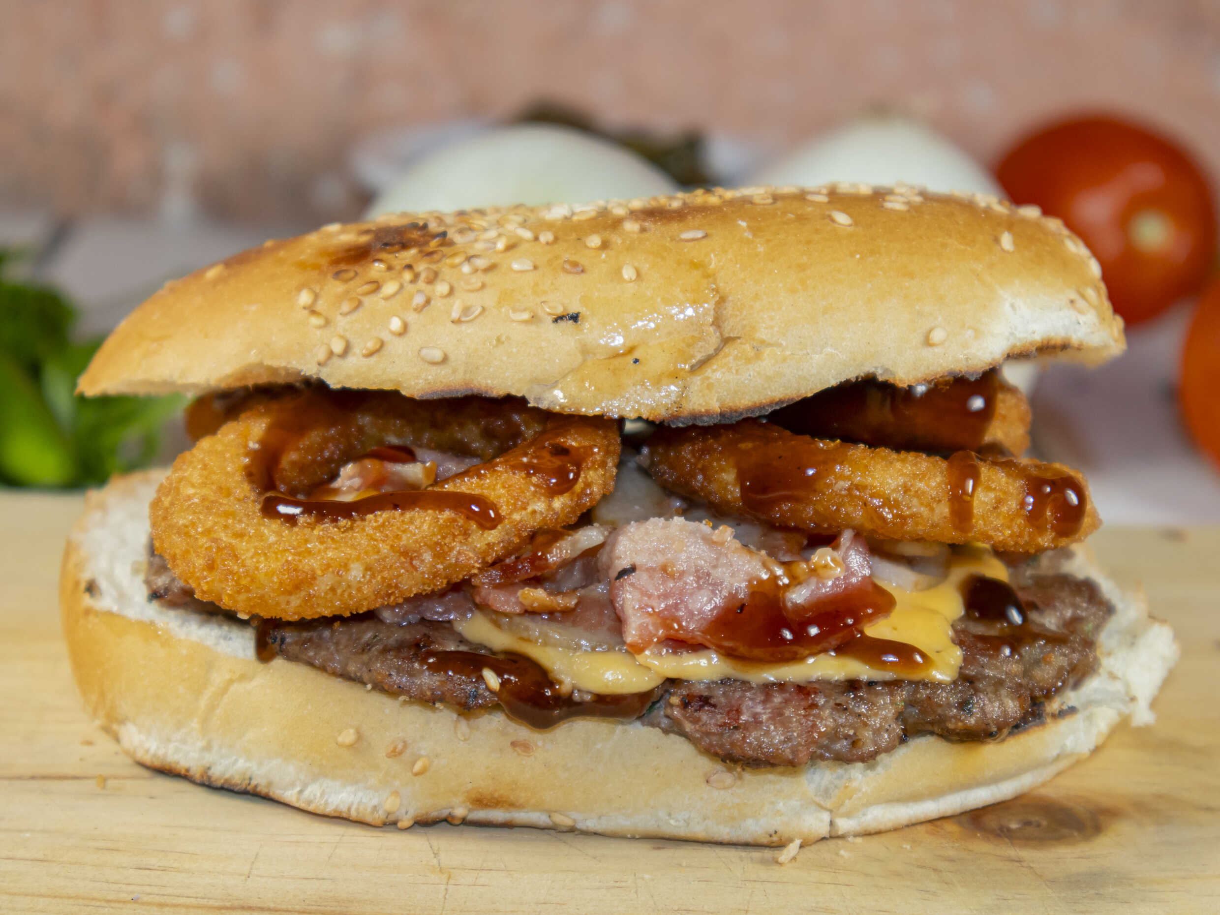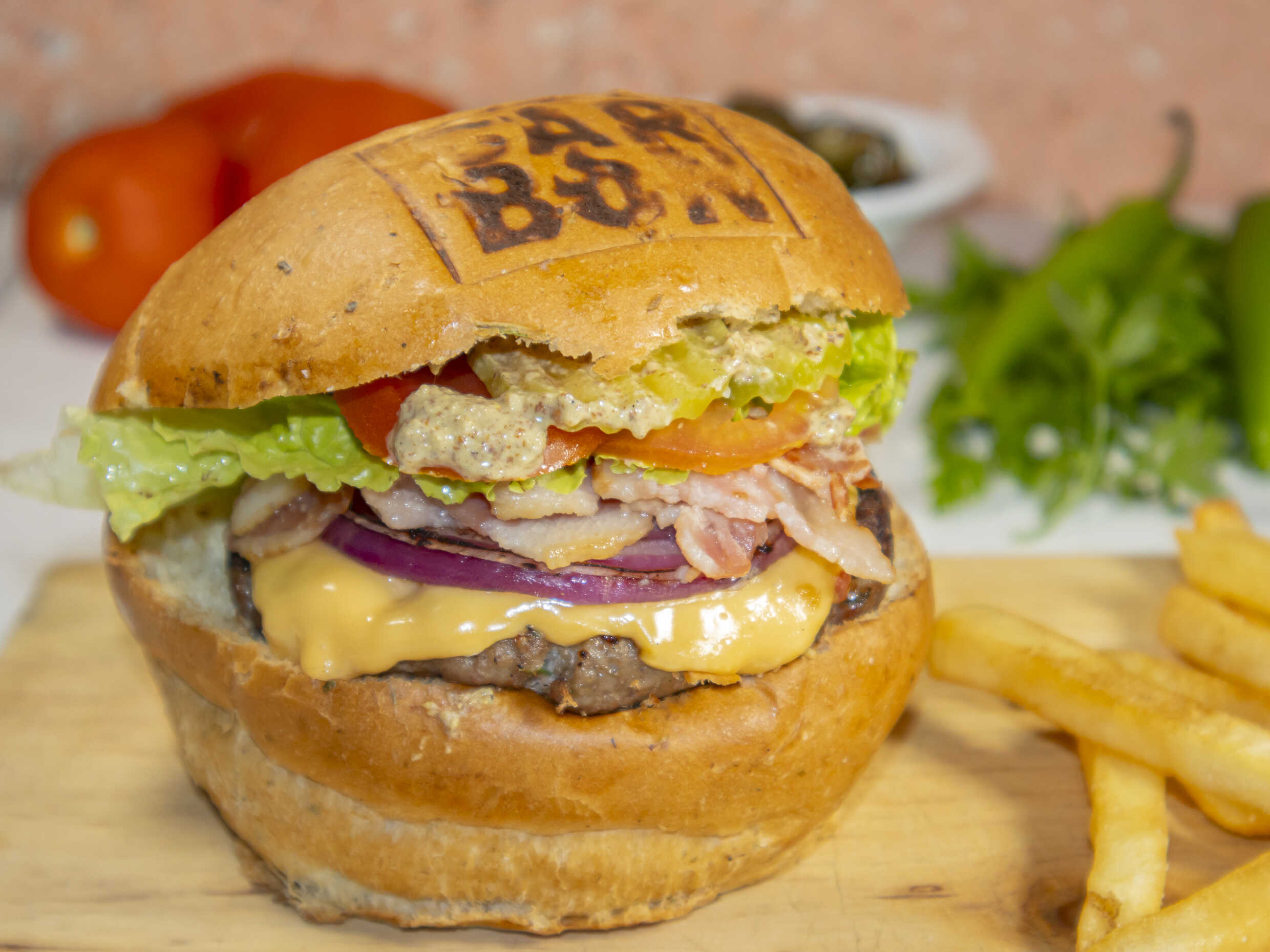 120 GRAMOS DE DELICIOSA CARNE DE RES PREMIUM ELABORADA ARTESANALMENTE Y ASADA AL CARBON, QUESO GOUDA, TOCINO AHUMADO, AROS DE CEBOLLA AMPANIZADOS Y SALSA BBQ