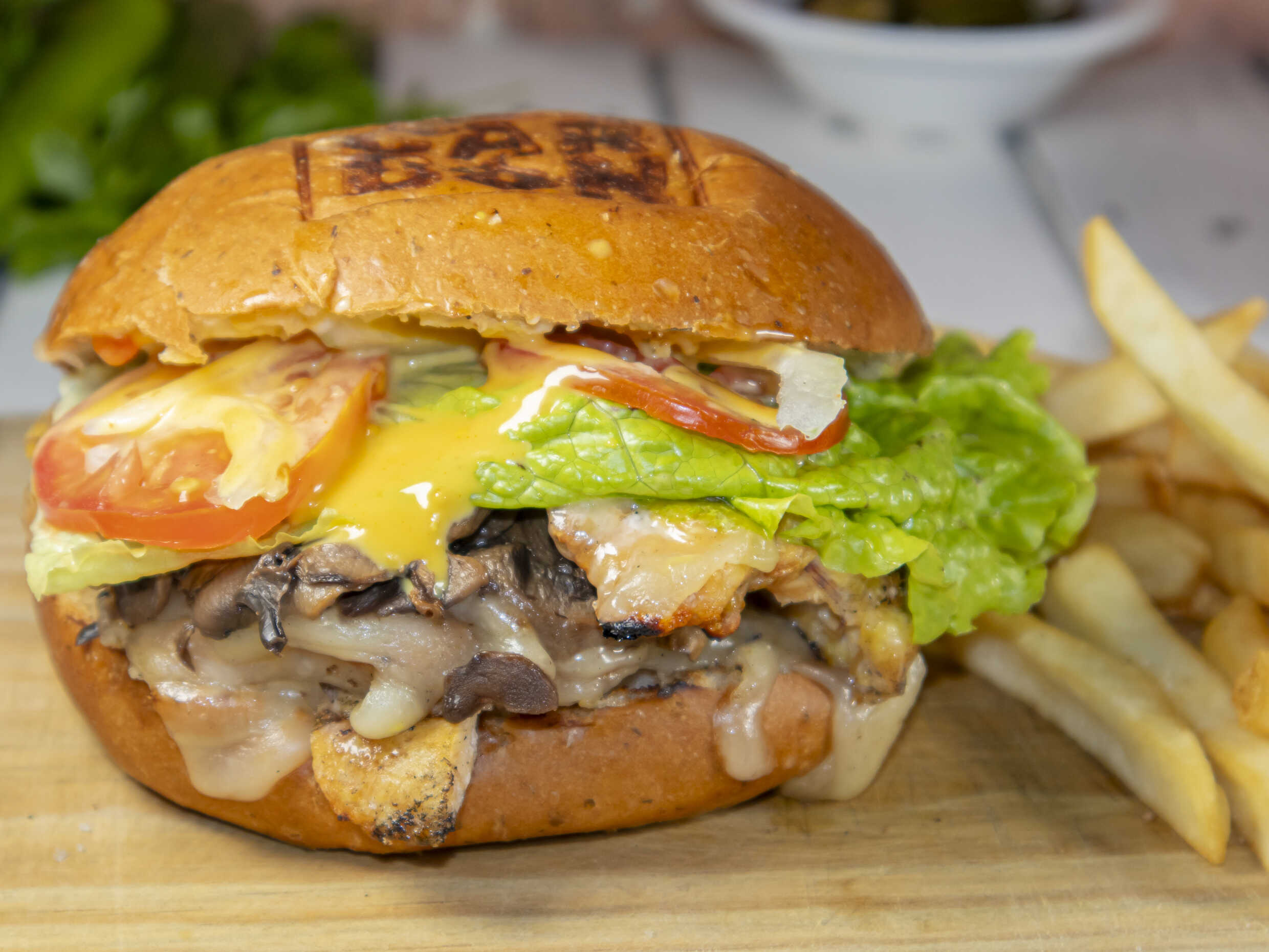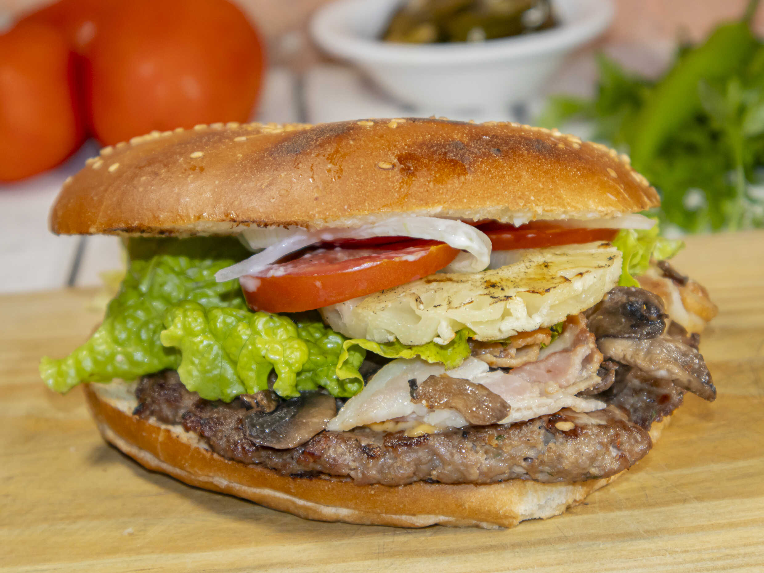120 GRAMOS DE DELICIOSA CARNE DE RES PREMIUM ALABORADA ARTESANALMENTE Y ASADA AL CARBON QUESO GOUDA , TOCINO AHUMADO , CHAMPIÑONES NATURALES PIÑA ASSADA , JITOMATE, LECHUGA ROMANA Y CEBOLLA