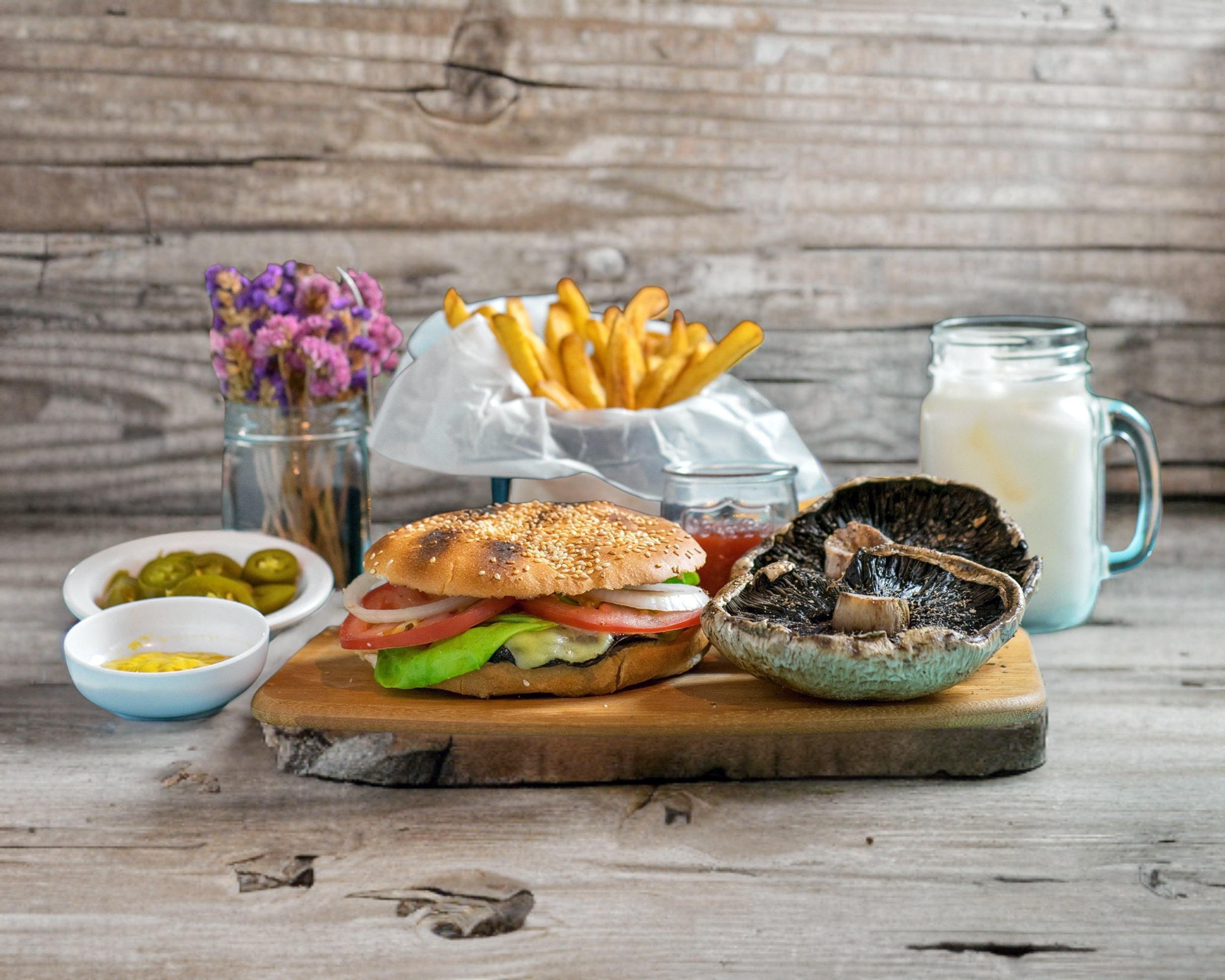 Hongo porto bello sazonado alas finas hierbas y asado al carbón, queso gouda , jitomate y lechuga tomate y cebolla.
