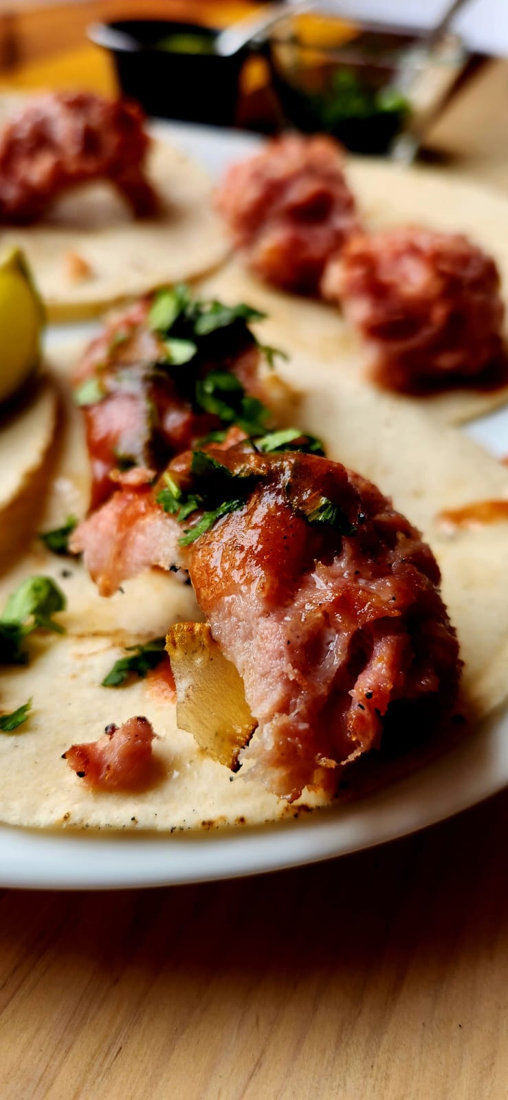 Jugosa carne de cerdo deshebrada sazonada con especias, salsa , comedias y pan artesanal