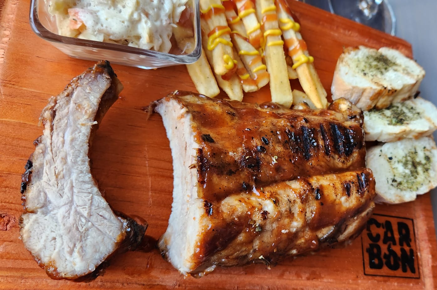 300 gr de Costilla de cerdo asada al carbón a la BBQ and beer acompañada con puré de papa casero, ensalada comedias y pan con ajo.