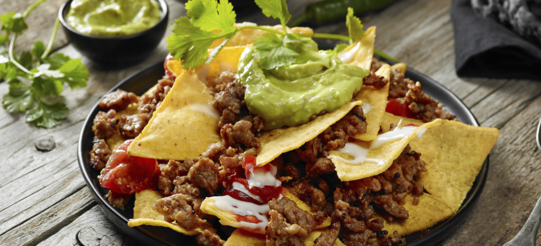 Totopos con queso amarillo derretido, frijol, jalapeños, tomate y cebolla picados.
