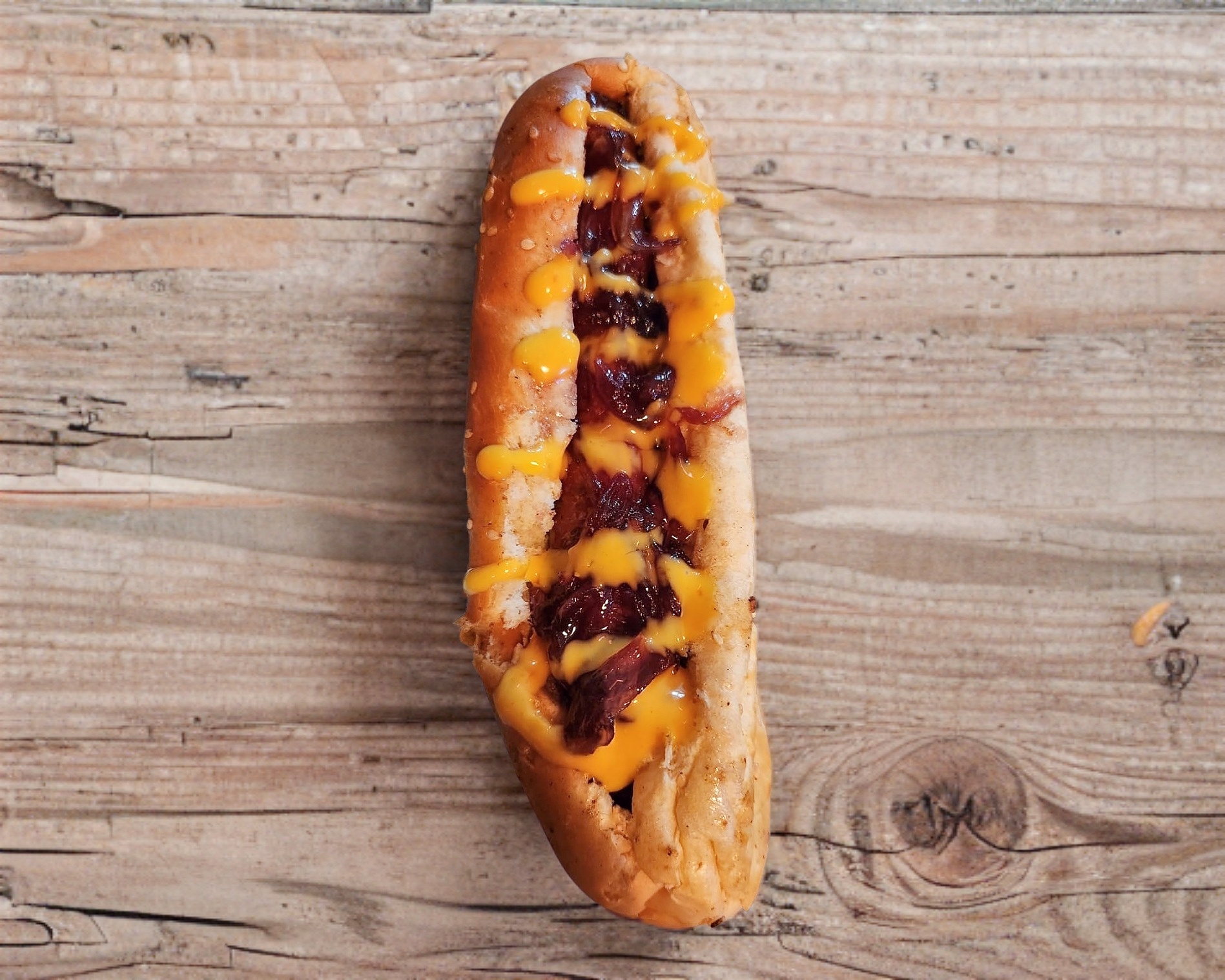 Delicioso hotdog con pan y salchicha tipo frankfurtelaborada artesanalmente sin conservadores cebolla caramelizada y aderezo honey mustard.