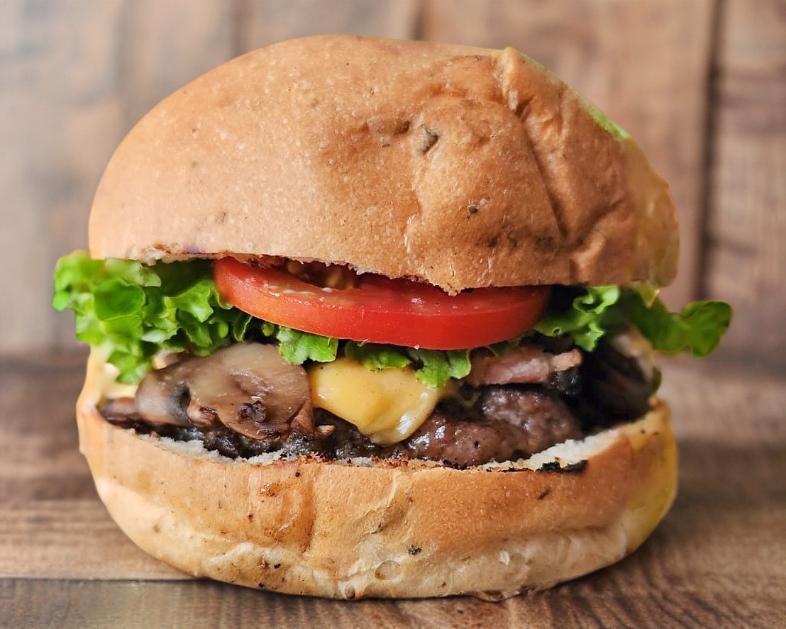 150 grs de deliciosa carne de sirloin elaborada artesanalmente y asada al carbón, queso americano, tocino ahumado, champiñones naturales, piña asada, jitomate, lechuga romana y cebolla.