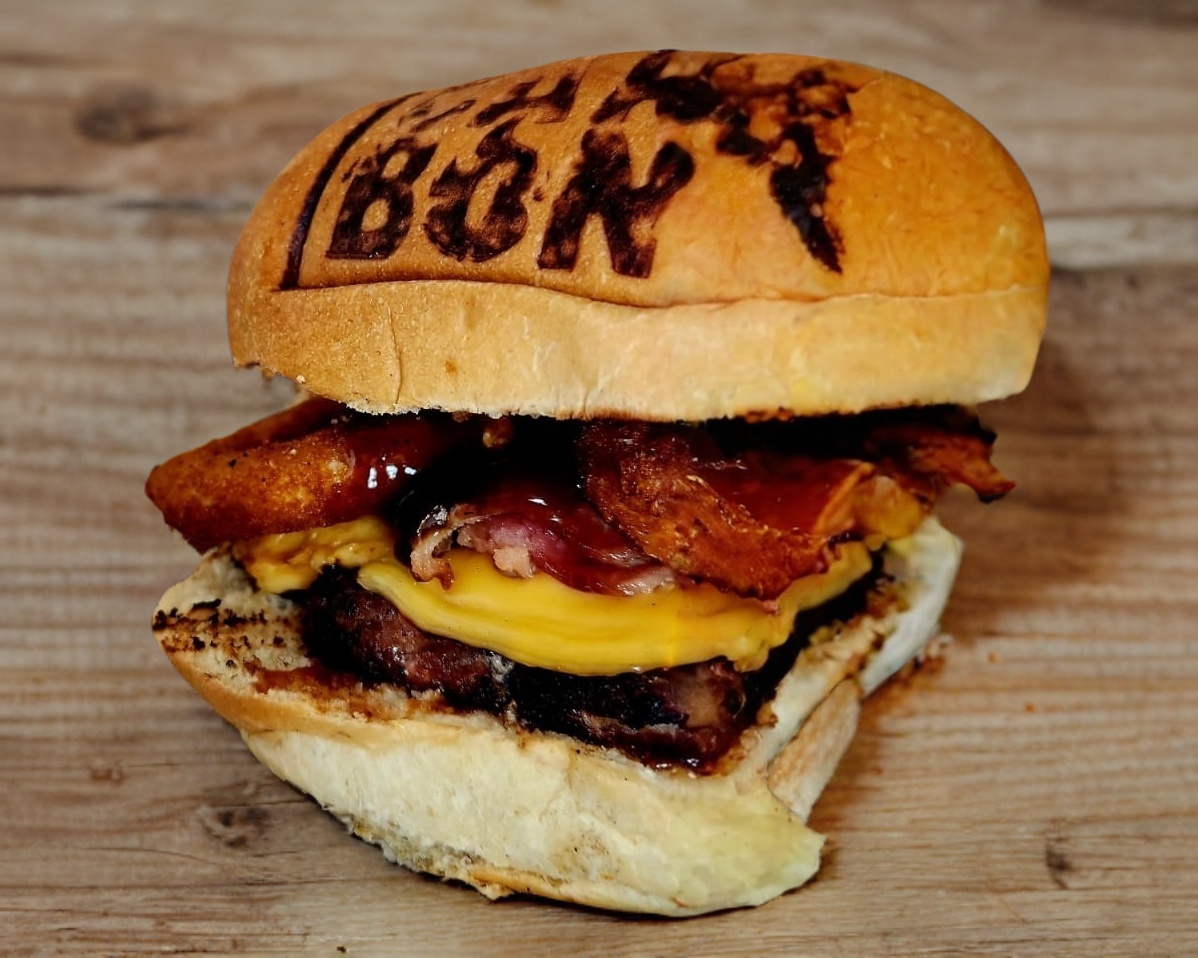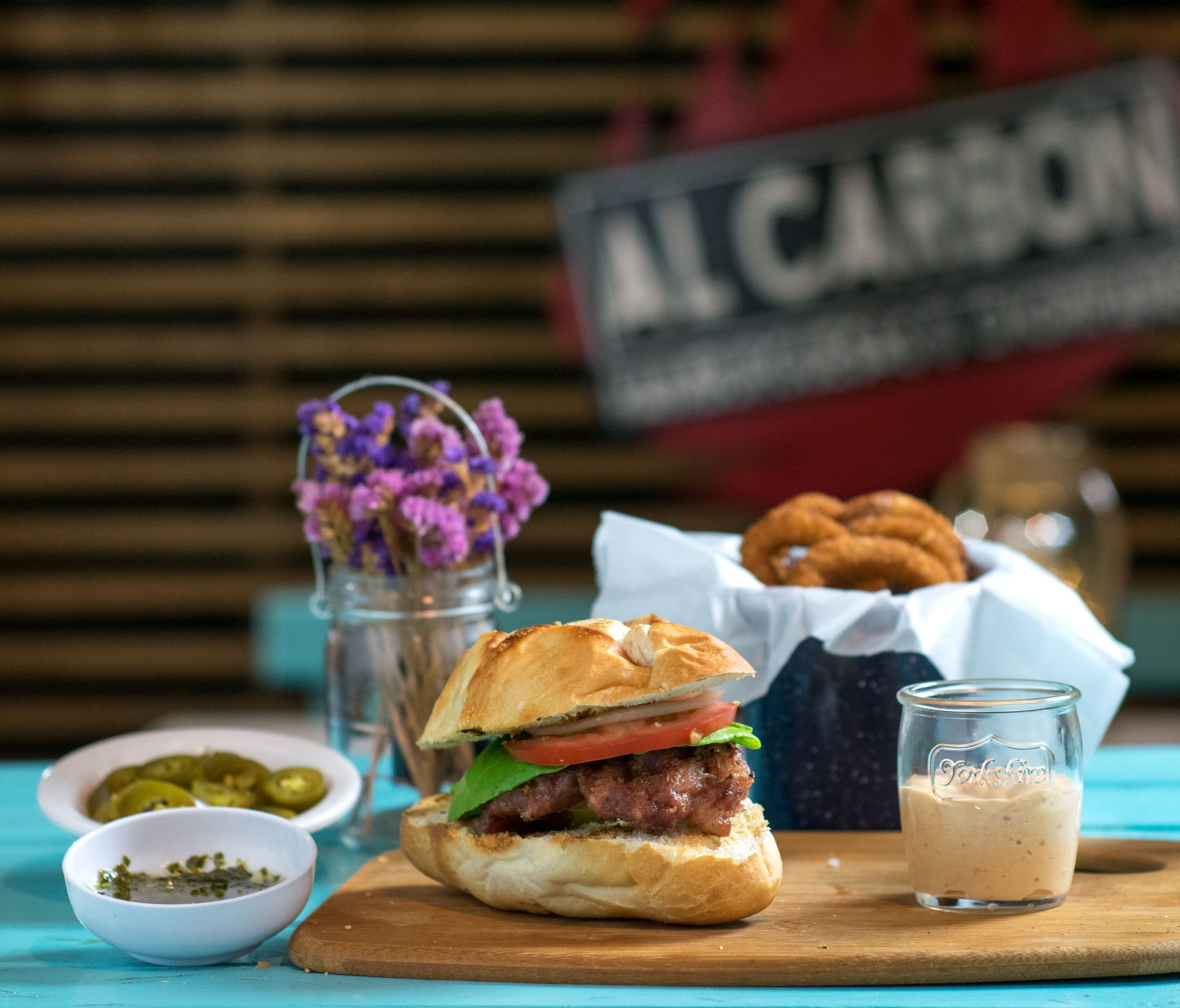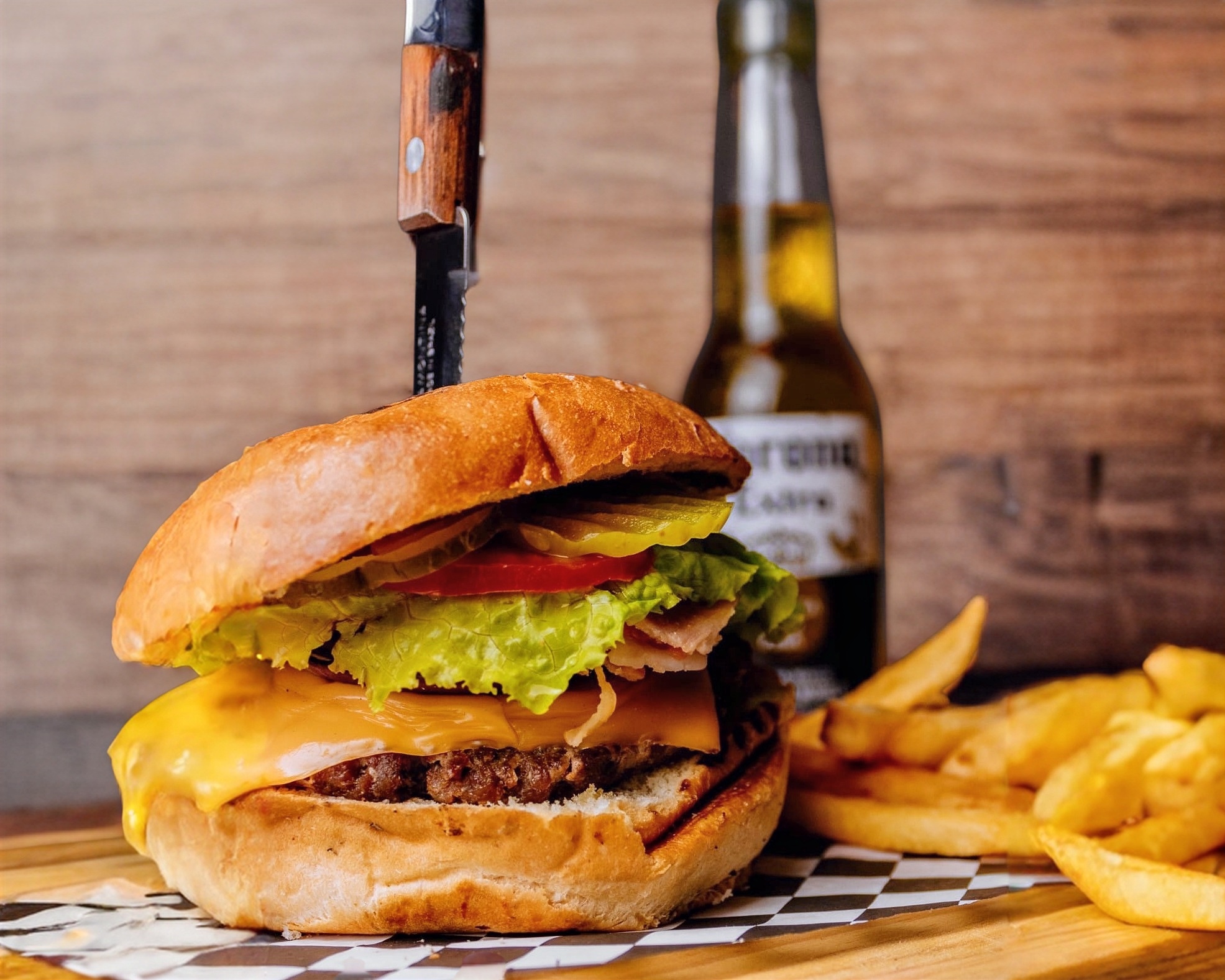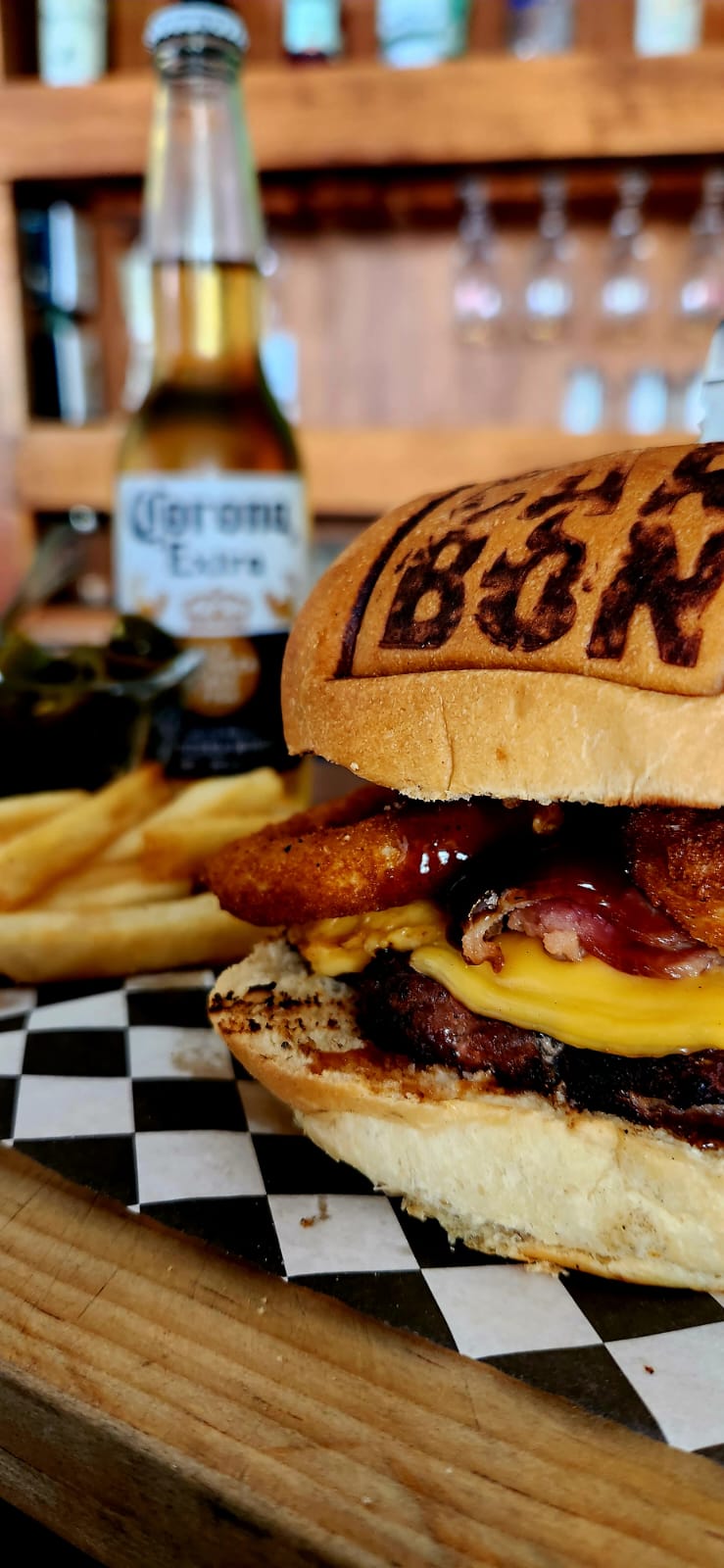 150 grs de deliciosa carne de sirloin elaborada artesanalmente y asada al carbón, queso americano, tocino ahumado, aros de cebolla empanizados y salsa barbecue.
