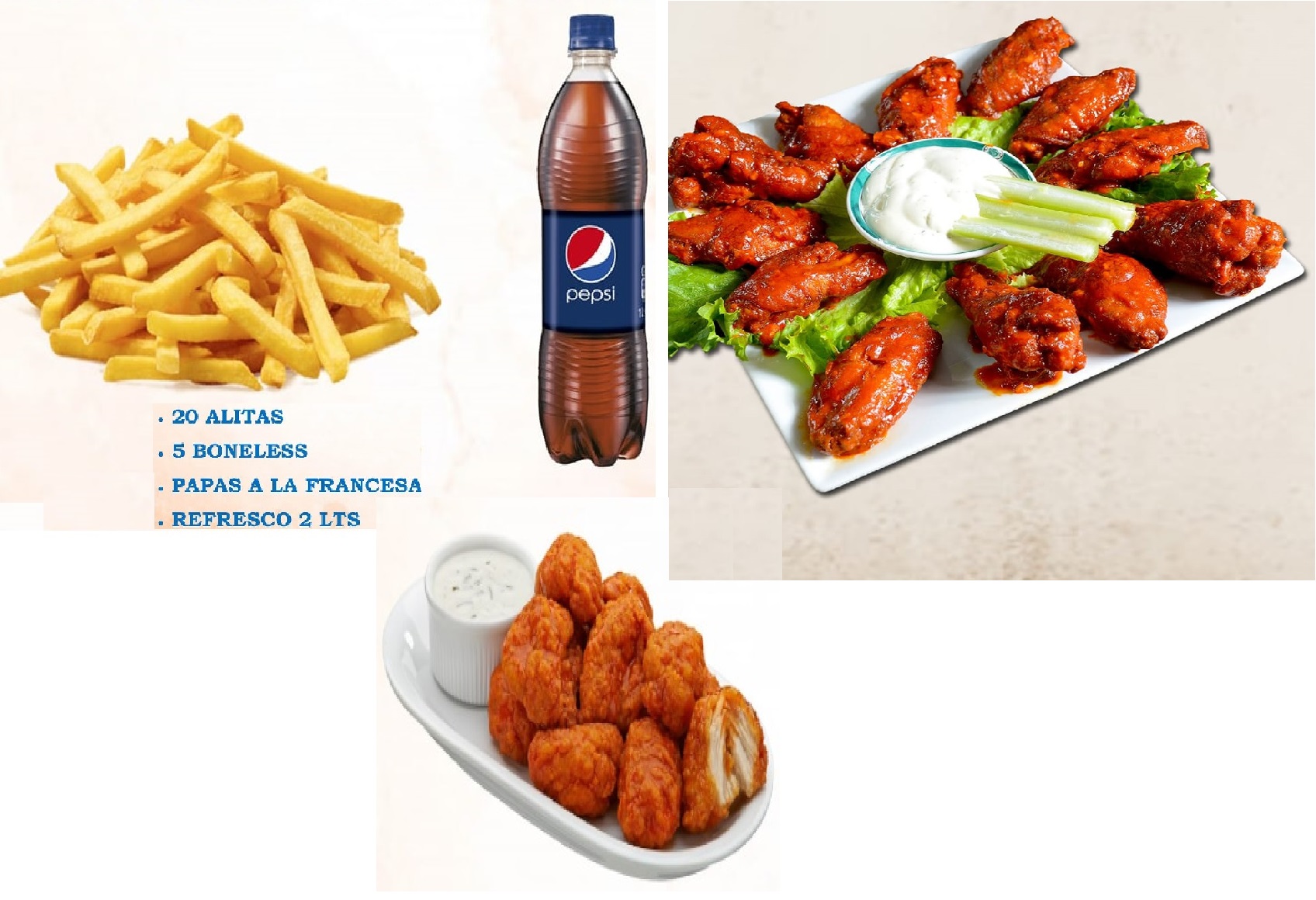 20 alitas con 2 sabores, 5 boneless con 1 sabor, papas a la francesa y 2 lts. de refresco.