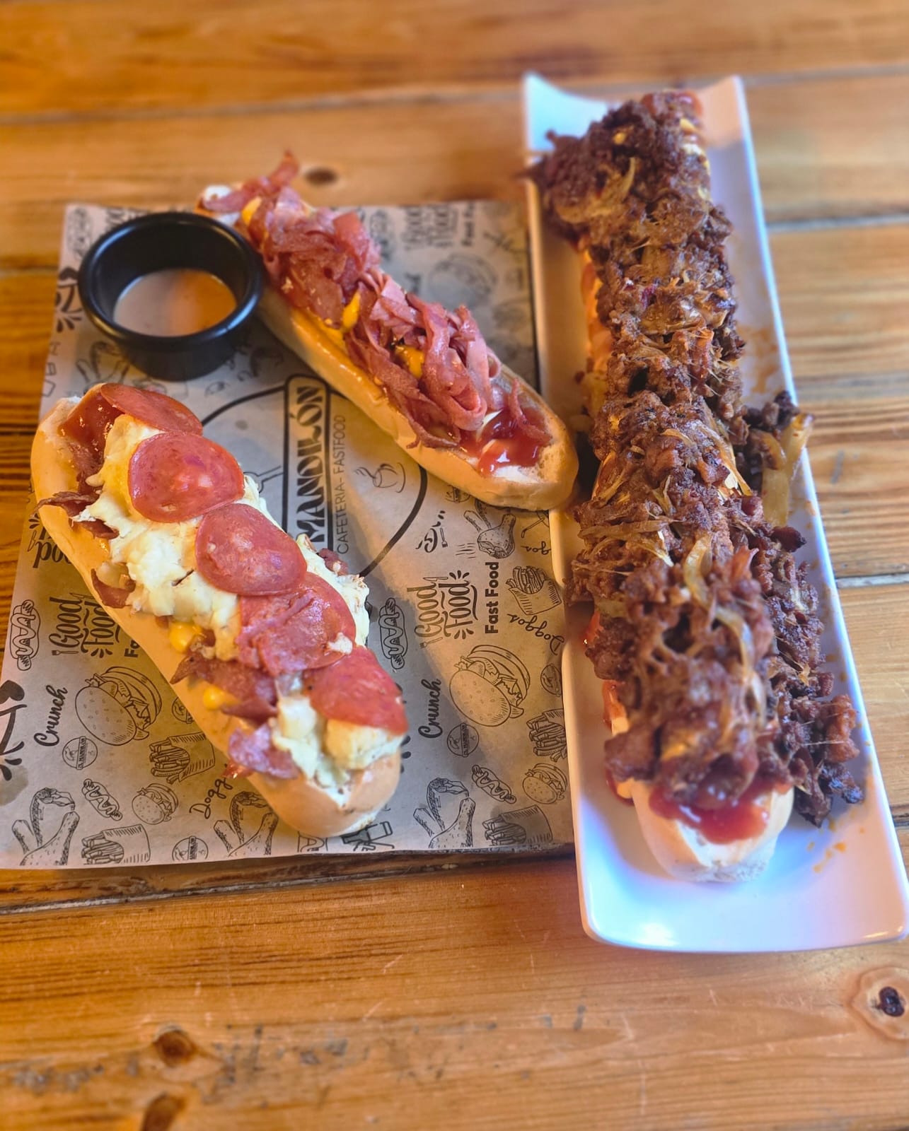 - Pan de casa - Salchicha de pavo empanizada - Queso cheddar - Catsup - Mayonesa - Cebolla - Costra de queso con carne mixta - Papas a la francesa (100 gr)
