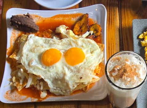 Chilaquiles de tu preferencia. Incluye bebida (café, té o jugo), plátano frito, frijoles, tortilla y 5 mini churros.